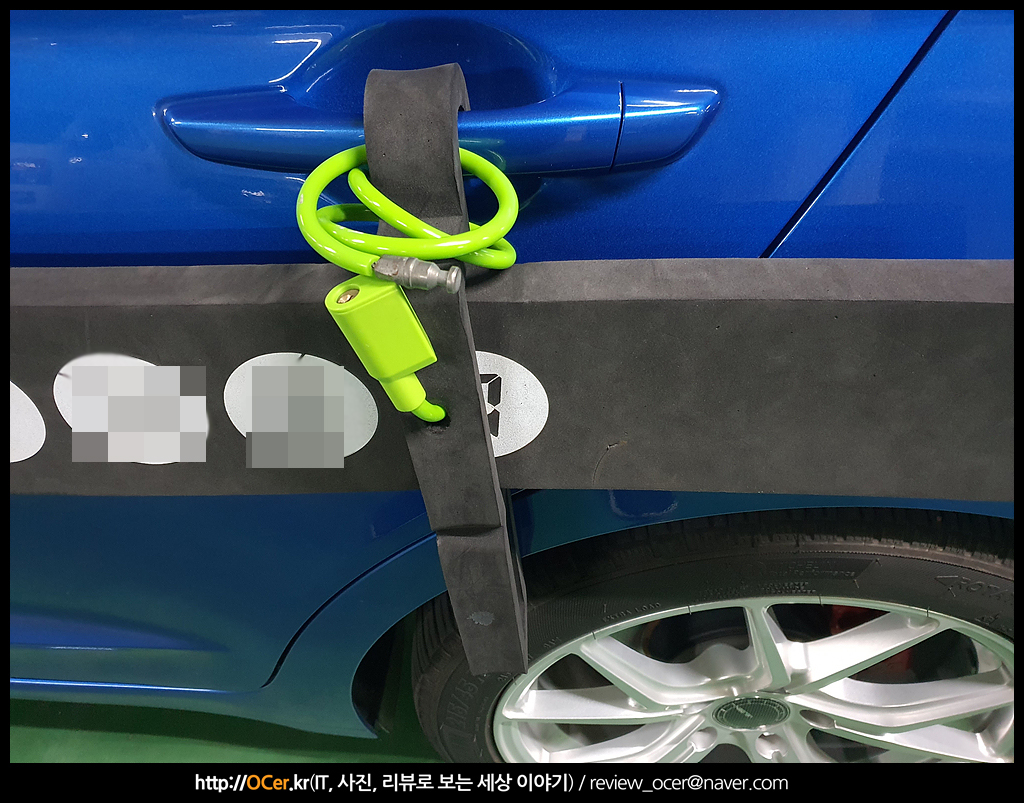 그래서 생각해낸 것이 바로 와이어형 자물쇠 입니다. 위와 같이 구멍을 뚫어서 도어에 같이 한번 끼워주고 잠급니다. 위 제품은 다이소에서 몇천원이면 구입할 수 있는 자물쇠 이구요. 절단기로 끊기 전에는 끊어지지 않습니다. 1대만 댈 수 있는 곳에 주차할 때는 도어패드를 걸어둘 필요가 없지만 혹시나 문콕 발생 확률이 높은 마트나 음식점 등의 주차장에서는 필수로 걸어둡니다.