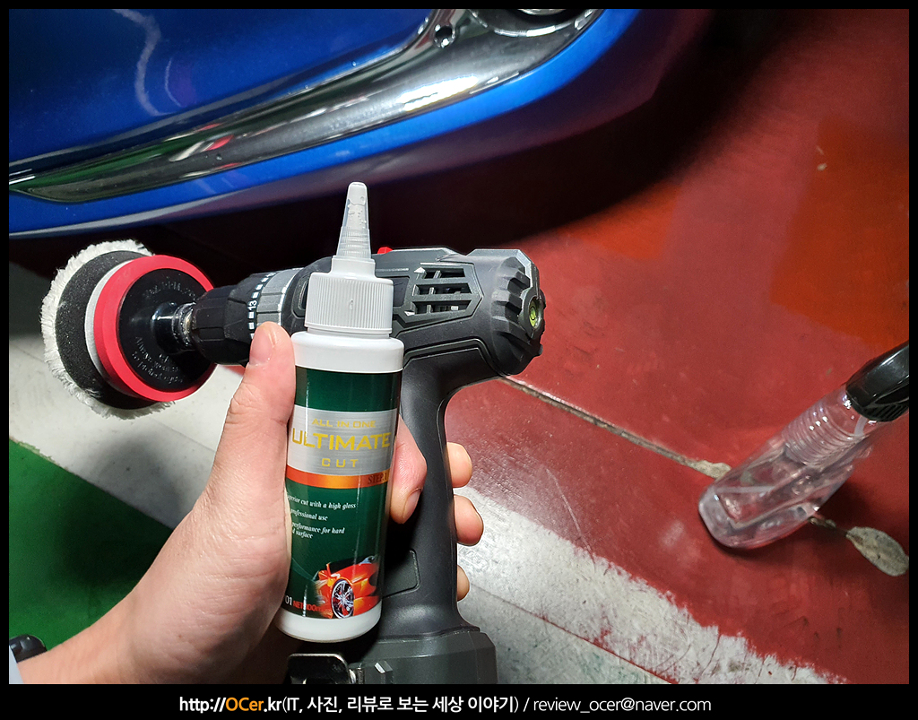 무션 폴리셔도 있지만 오늘은 이번 글에서 소개하는 드릴광택기 세트로 진행해 봤습니다. 컴파운드는 올인원으로 사용할 수 있는 울티메이트 컷 입니다.