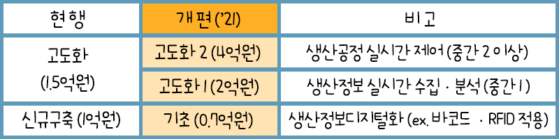 》 2020 스마트공장은 레벨과 관계없이 신규 또는 고도화로 지원하던 보급사업 지원체계였다면, 2021 스마트공장은 레벨 향상에 따라 차등 지원하는 질적 고도화 중심으로 개편되었습니다.