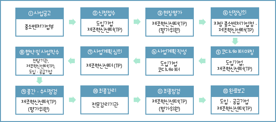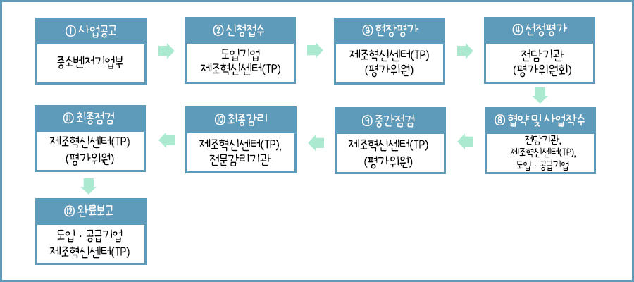 》 중소기업 제조 현장의 경쟁력 제고를 위하여 중소벤처기업부에서 추진하고 있는 지원사업입니다. 제조업의 모든 공정에 ICT(정보통신기술)을 적용하여 설계부터 제조, 유통, 물류까지 디지털 자동화 솔루션을 결합시켜 품질과 생산성은 높이고 원가는 낮추는 지능형 공장으로 만들기 위한 솔루션 도입비용을 지원해주는 사업입니다!