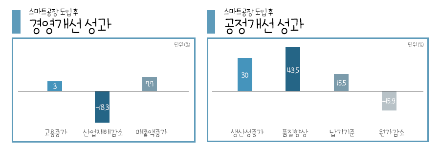 스마트공장지원사업 도입 후 고용증가, 산업재해감소, 매출액증가, 생산성증가, 품질향상, 납기기준, 원가감소등의 효과가 나타났습니다.
