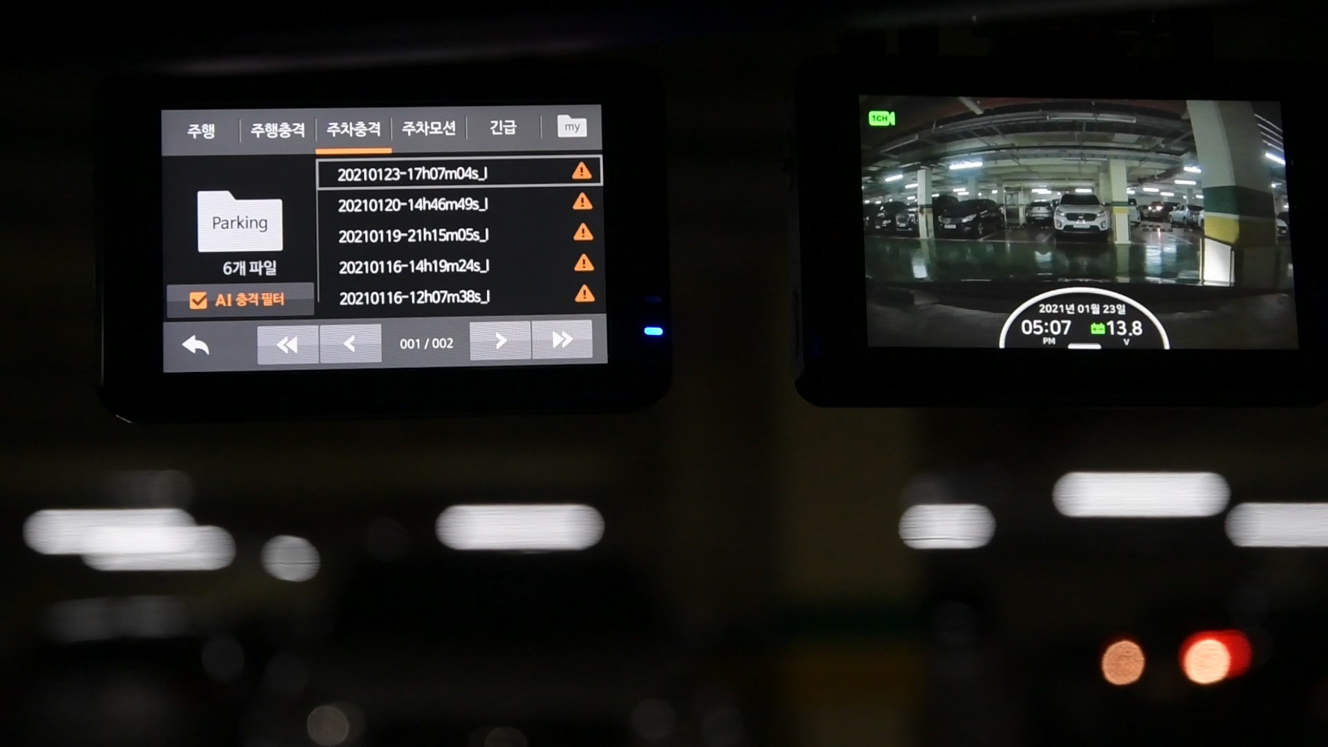 원래 주차녹화시 충격이 와도 충격 알림음이 안나오는지는 몰라도 위 동영상 상으로는 엄청 강하게 손으로 충격을 주고 있습니다. 그리고 그 결과 딱 1건의 충격이 팝업으로 AI 충격 알림이라고 떴습니다. 재생을 시켜보면 안보이는 사각지대에서 충격이 났는지 내용은 보이지 않네요.