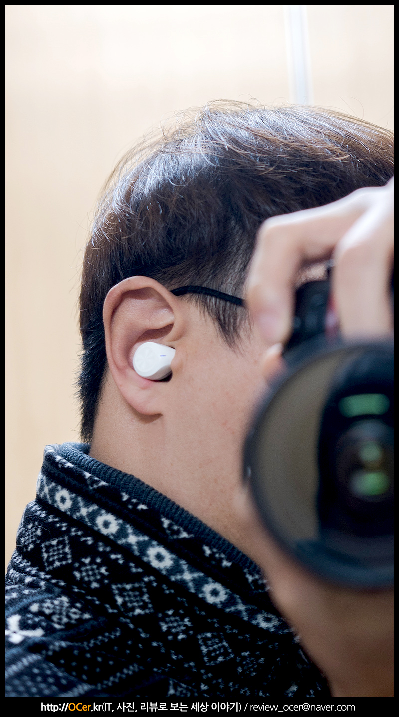 이어폰을 착용하면 이런 모양. 메뉴얼에는 사실 LED 가 윗 부분으로 가게 45도 각도로 착용하라 하였지만 저는 이게 더 편하더군요. 뭔가 딱 꽉 끼는 착용감이 좋아서 이렇게 들었습니다.