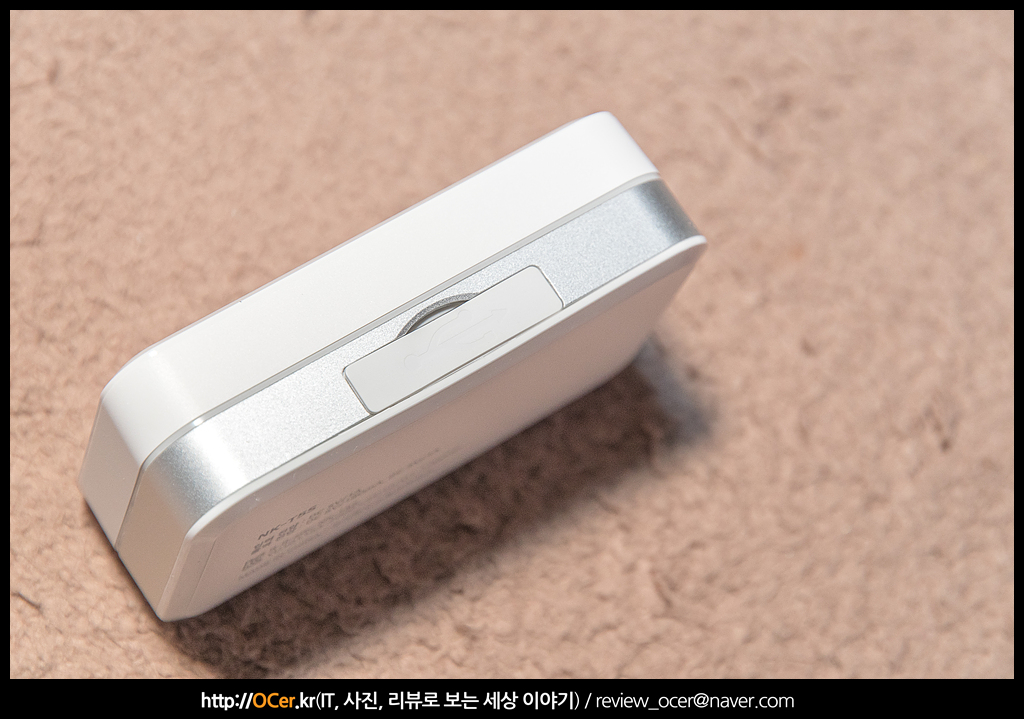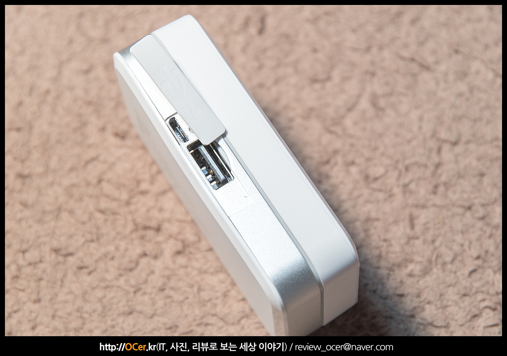 측면에는 고무 커버로 닫혀 있는 포트부를 볼 수 있습니다. 마이크로 USB 타입 포트와, USB 포트 입니다. 하나는 충전 케이스를 충전하기 위해, 다른 하나는 외부 기기를 충전할 때 쓰입니다.