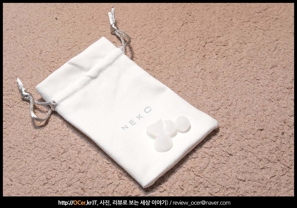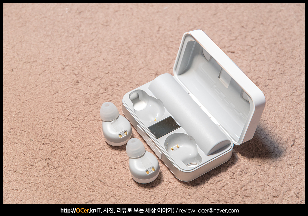 전체 구성품 입니다. 메뉴얼과, 품질보증서, 충전용 마이크로 USB 케이블과, 실리콘팁 두쌍(총 3쌍 중 한쌍은 껴져 있음), 충전 케이스와, 파우치가 있습니다.