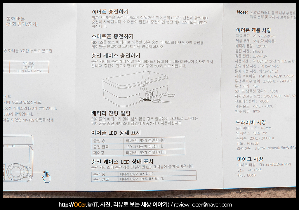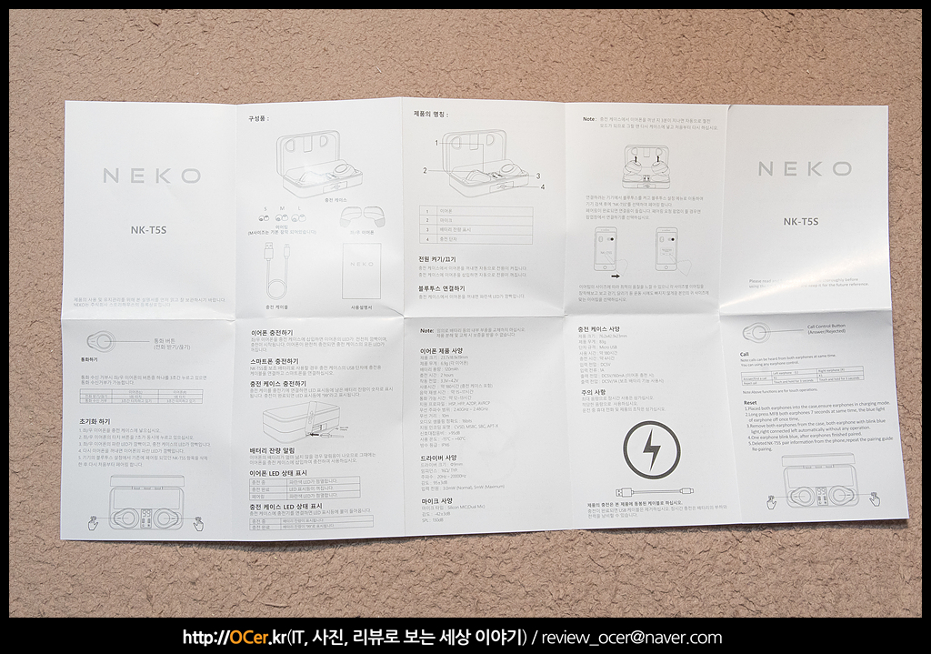 후면에는 네코 NK-T5S 완전 무선 블루투스 이어폰의 특징에 대해 소개하고 있습니다. 한글/영문으로 표시하였으며, 앞에서 언급하지 않은 특징에는 블루투스 5.1 지원으로 수신거리 및 재생시간이 길어졌다는 것과, IPX7 등급의 방수 지원, 클리어토크 노이즈 캔슬링, 충전 케이스에서 LED 로 배터리 상태를 표시해주는 것 등이 있겠습니다.