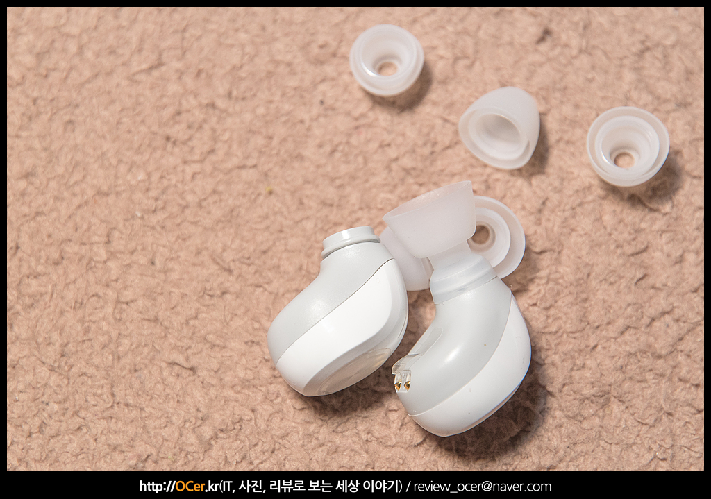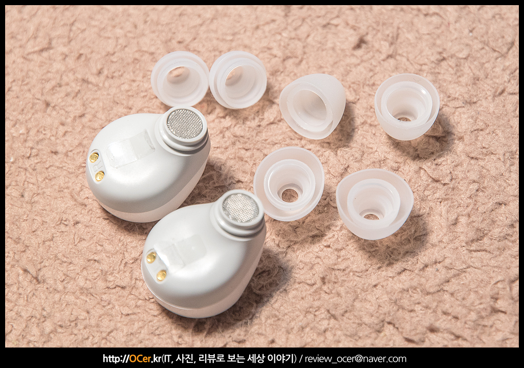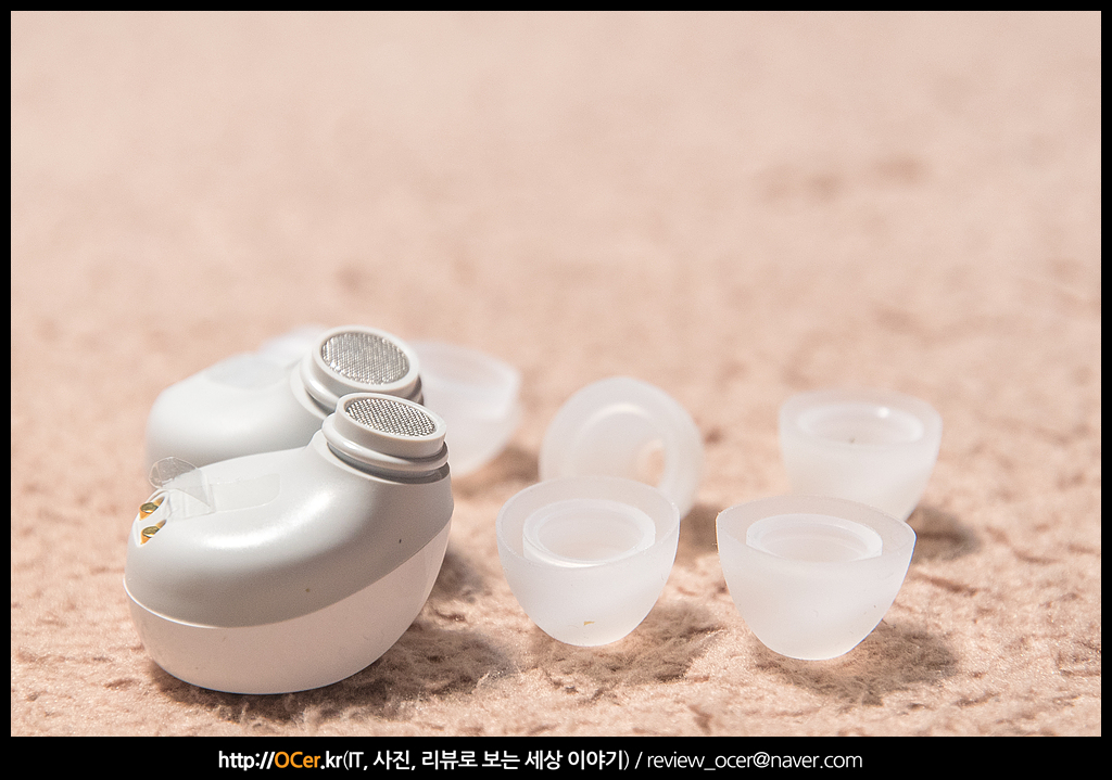이 중 한쌍은 이미 이어폰에 껴져 있고, 나머지 두쌍을 통해 살펴보면, 실리콘 팁 크기가 매우 작고, 껴지는 부분(이어폰에서 노즐 부분) 이 매우 짧습니다.