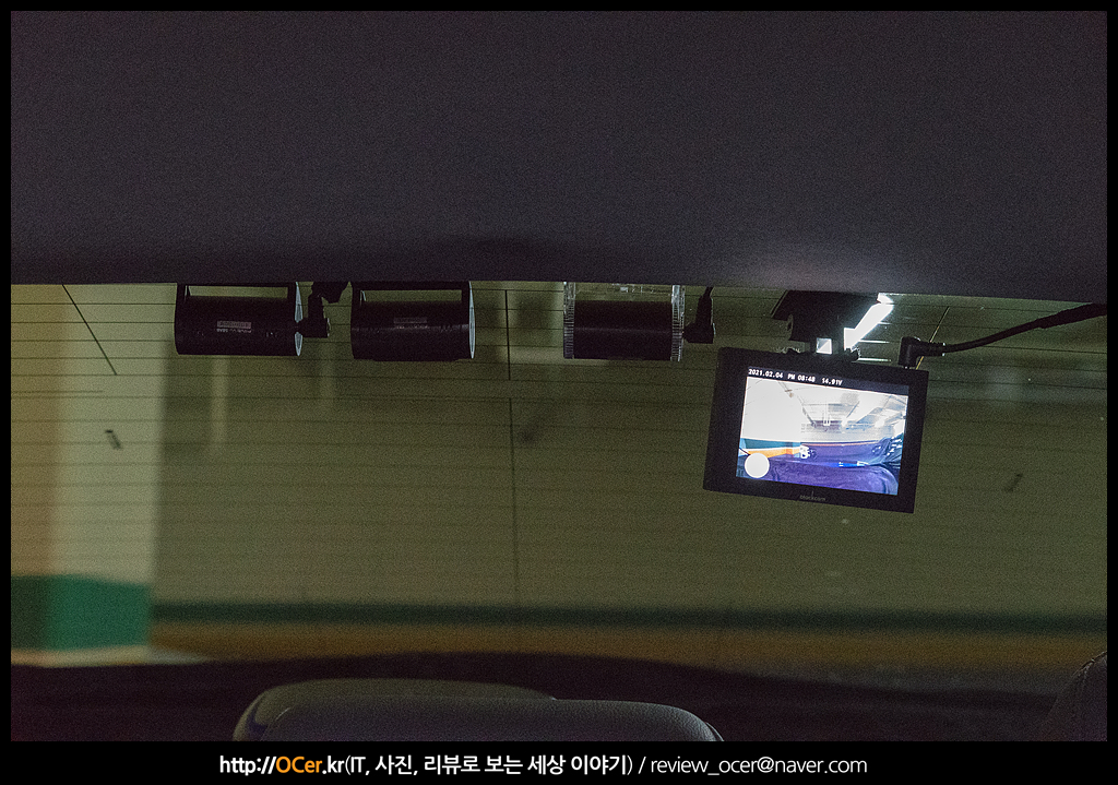 전방 카메라 잘 들어오구요~ 전방 케이블은 완전히 매립 & 부착하기 보다는 전원, 후방 카메라 테스트 후에 깔끔하게 정리하는 것이 좋습니다. 저는 저렇게 케이블을 늘어뜨려 놓은 후 2열 시트에서 눌러가면서 후방 카메라를 조절합니다. 제 차량은 세단이라 괜찮은데, SUV 차량이나 해치백 차량은 힘들 수도 있겠네요.