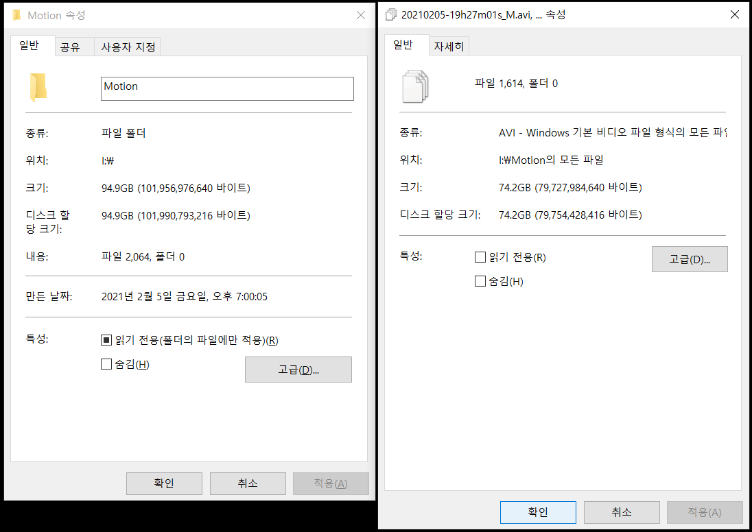 주차 모션 폴더는 이벤트랑 같네요. 하지만 숨김파일 제외하고 사용된 용량이 다릅니다. 모션도 20초씩 녹화 됩니다. 2064개 * 20초 = 41280초 = 688분 = 11.5시간 정도