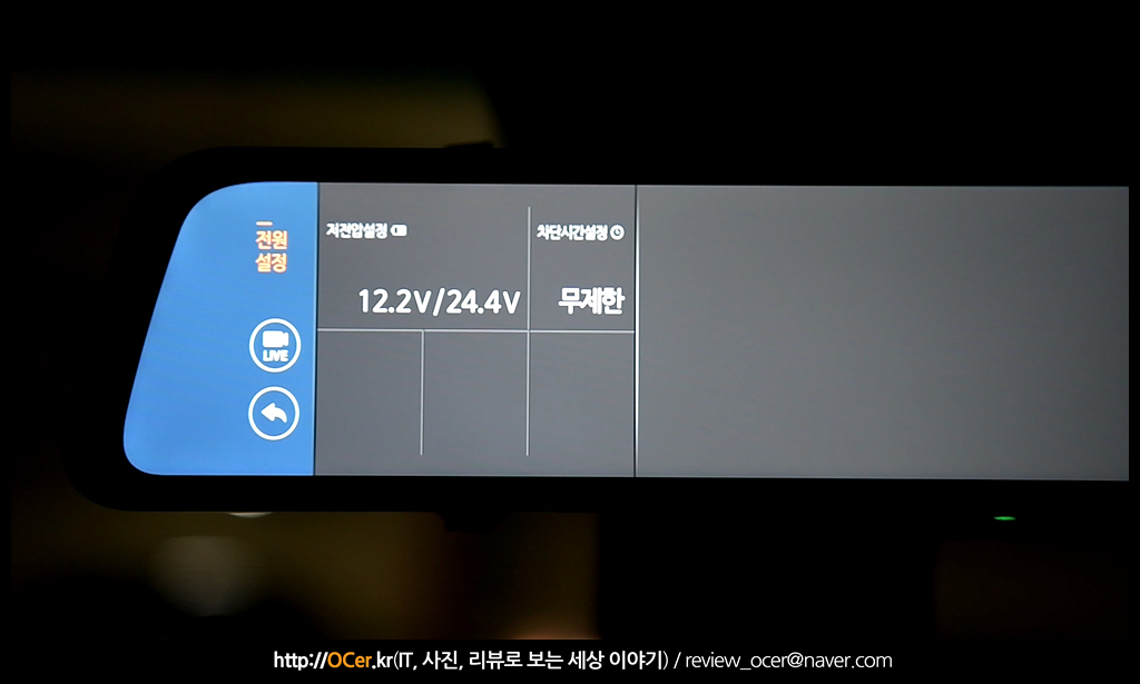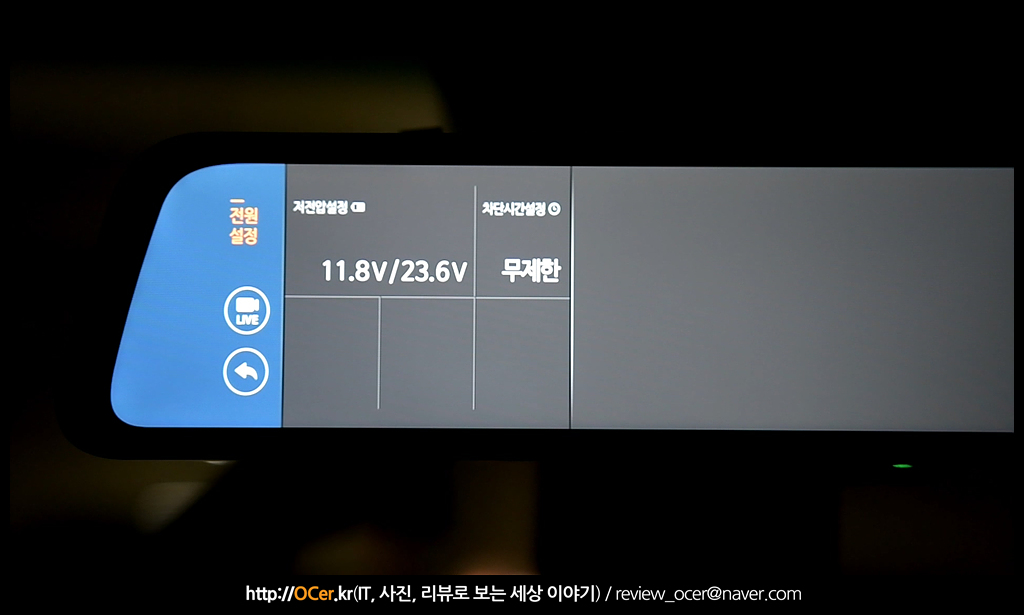저전압 설정은 승용차 기준 최저 11.8v 에 최고 24.4v 또는 보조배터리로 선택 가능하며, 차단시간 설정은 3시간 단위로 최대 48시간, 또는 무제한으로 설정할 수 있습니다.