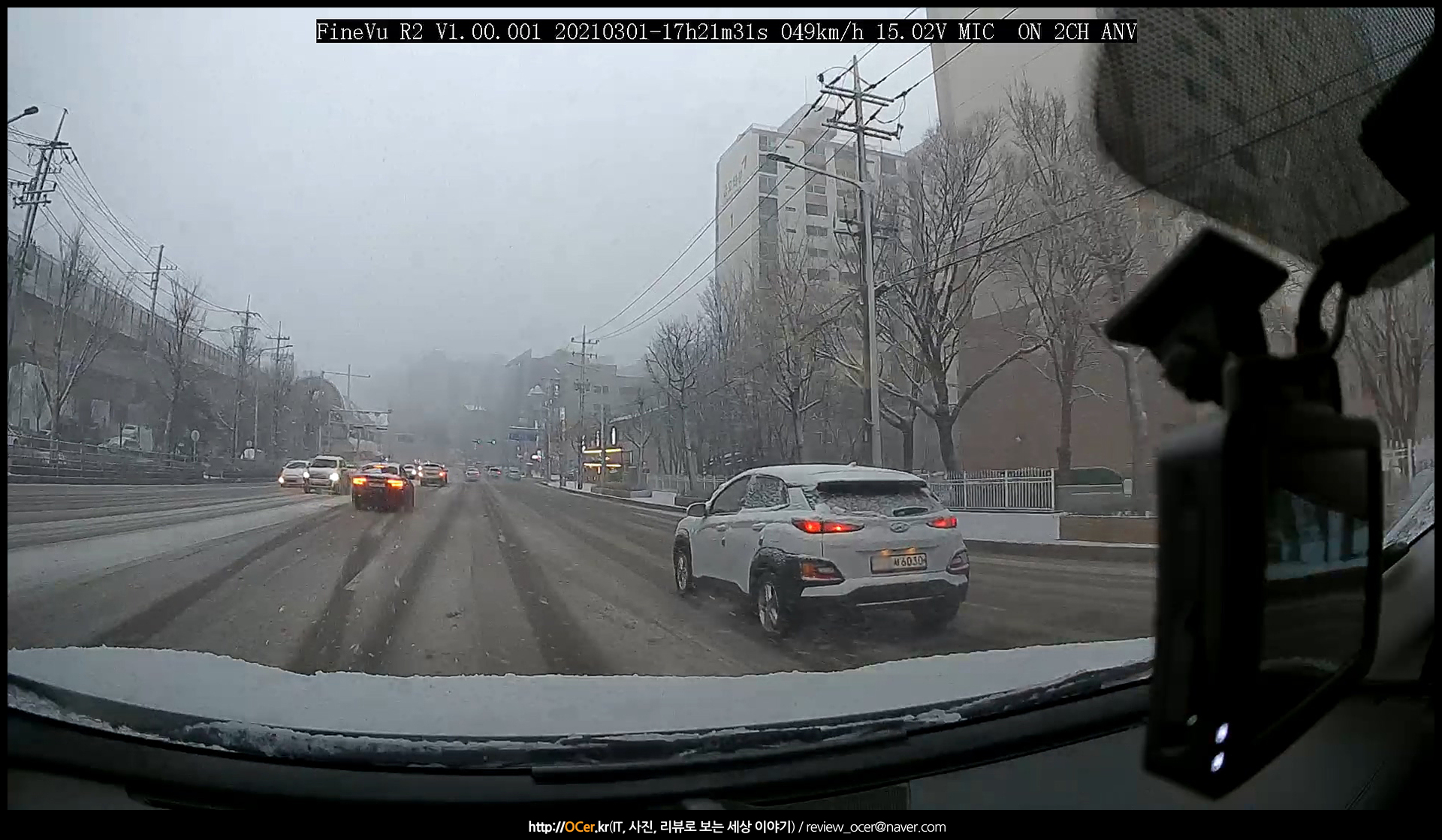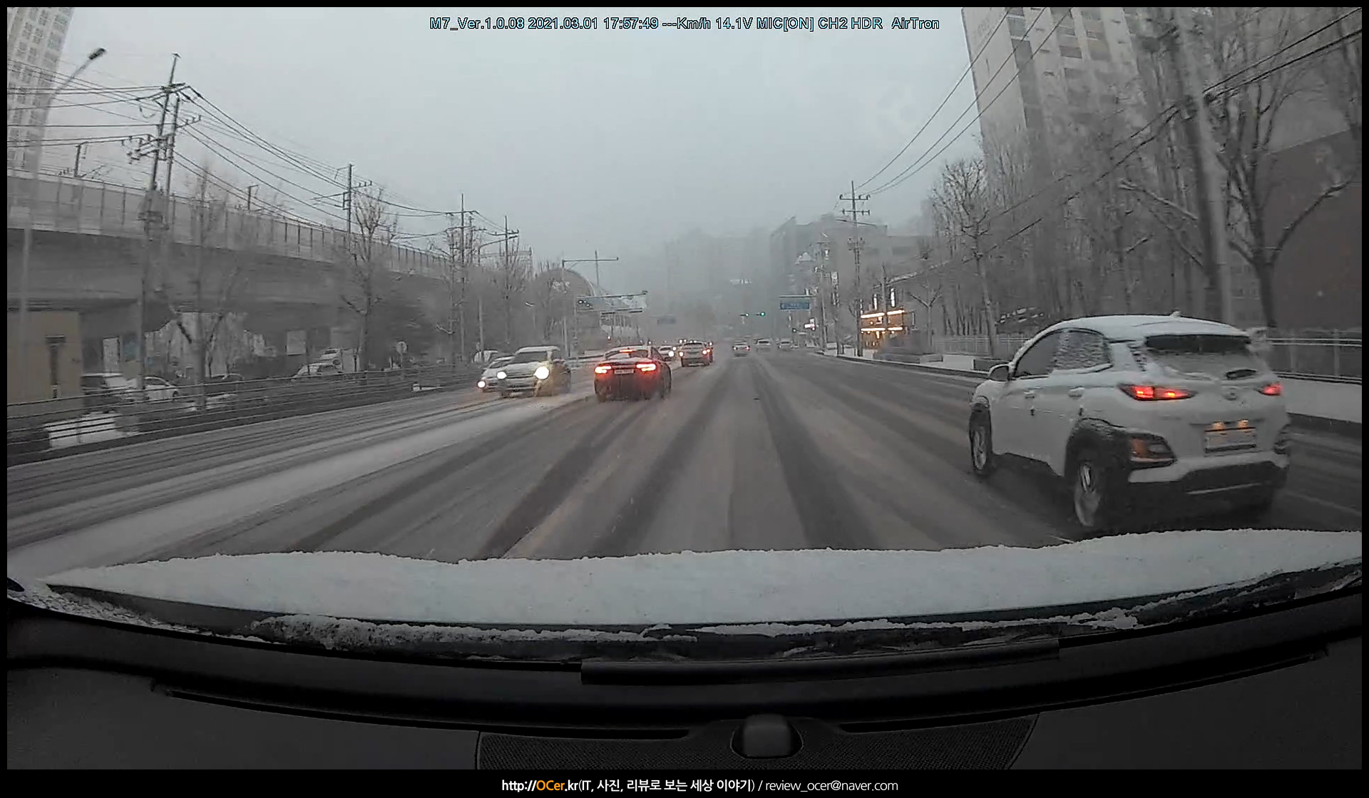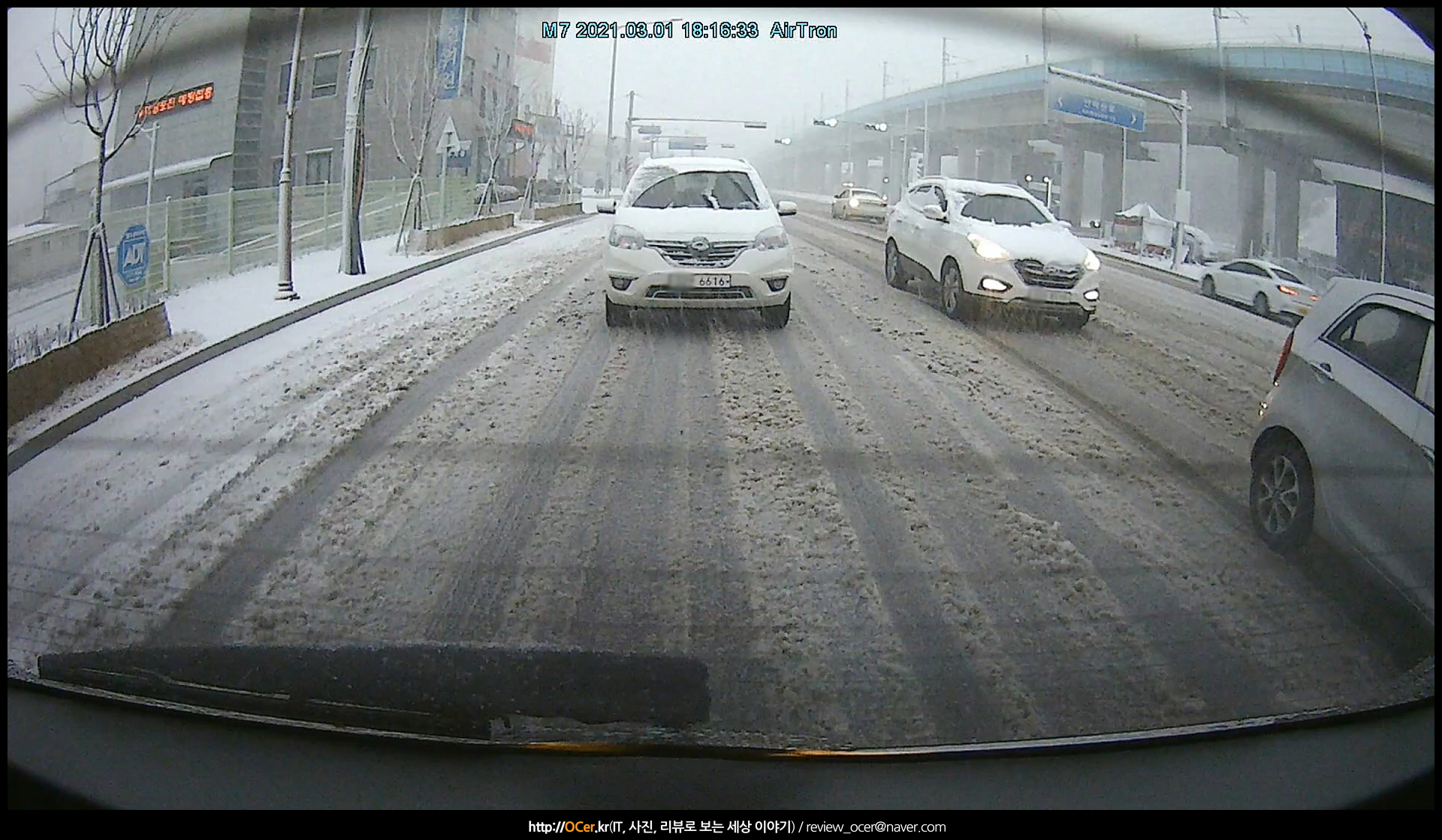 안녕하세요. OCer 입니다. 3월 첫째날 전국적으로 눈비가 많이 왔습니다. 제가 사는 곳도 비가 오다가 급기야 폭설이 내렸습니다. 기상악화 속에서도 열일하는 두 블랙박스 영상을 비교해 봅니다. 상황별로 영상을 비교해보니 밝은 날엔 파인뷰 R2 가 밝은 편인데, 어두운 날엔 에어트론 M7 이 더 밝았습니다.