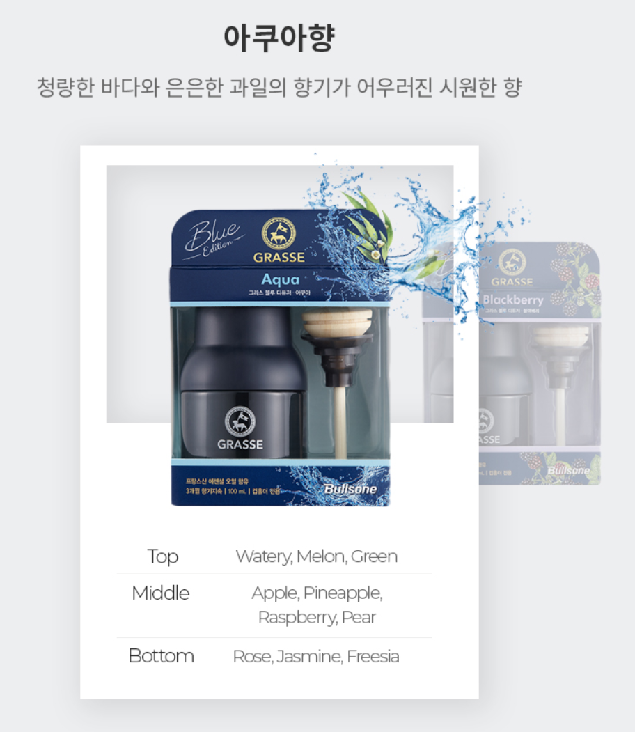 제가 받은 그라스 블루 아쿠아 향은 위와 같은 향으로 이뤄졌다고 합니다. 청량한 바다의 느낌과, 은은한 과일의 향기가 어우러진 시원한 향이라고 하는데, 인위적이지 않고, 시원하고 상쾌한 그런 향인데, 어떻게 표현이 안되네요. 아무튼 저는 실제로 써보니 너무 좋아서 여자친구에게도 선물해 주었습니다.