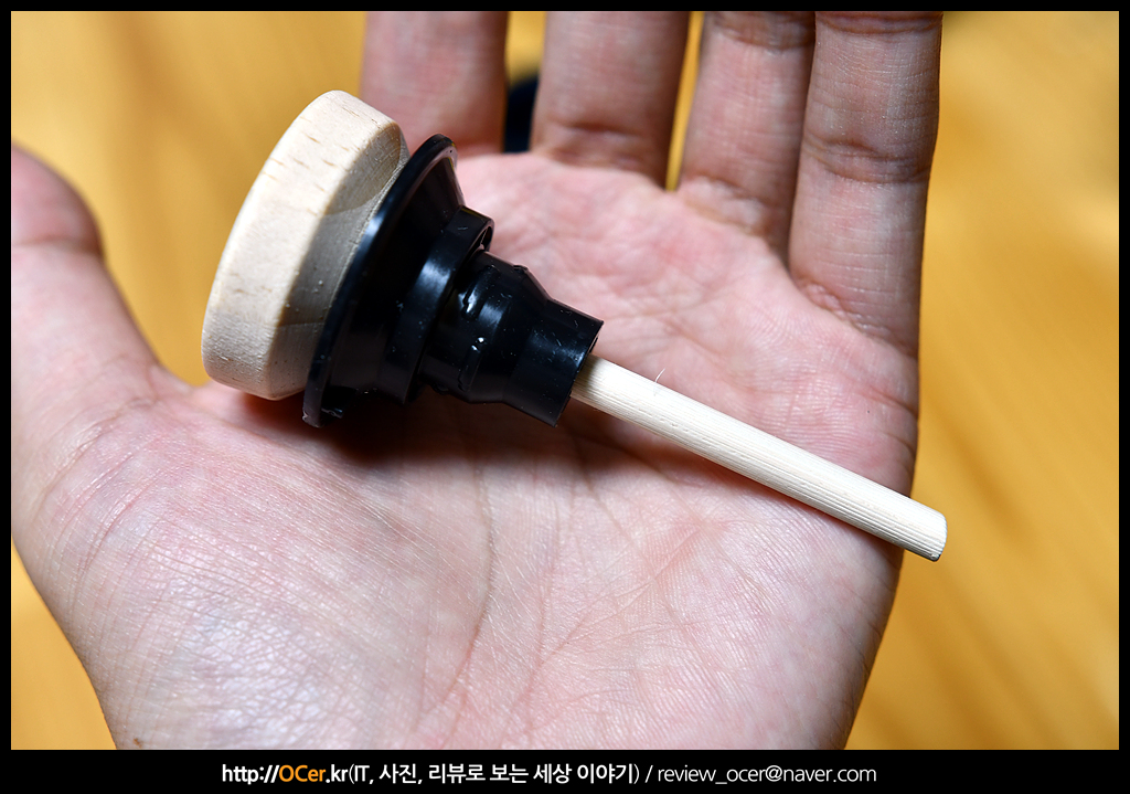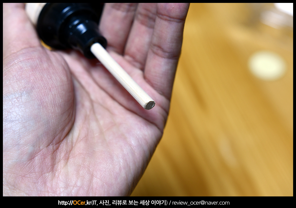 우드 스틱은 이런 모습입니다. 스틱이 꽤 긴 편이고, 아랫쪽부터 흡수되어 윗쪽 넓은 면에서 발향되는 원리(?) 입니다.