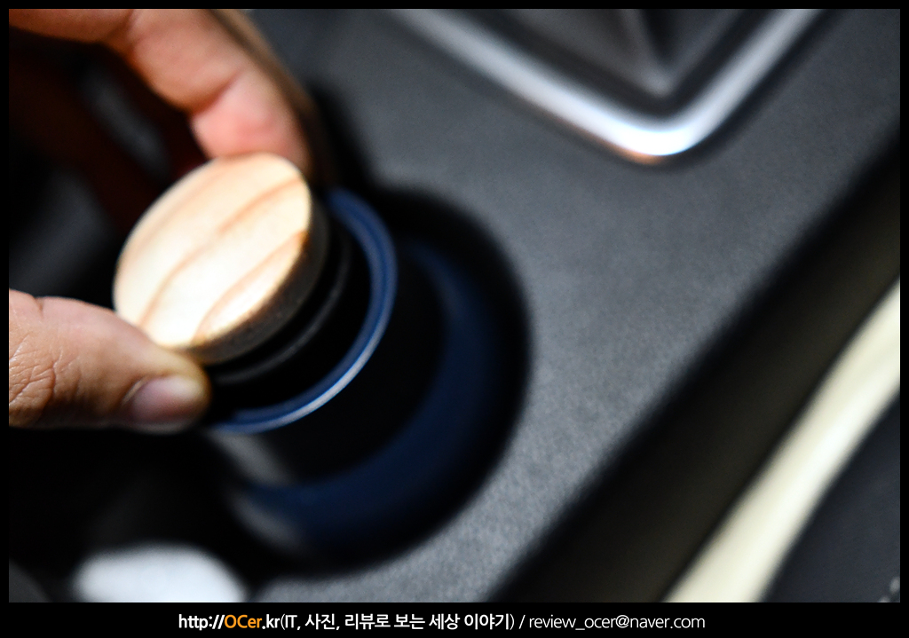 2개의 컵홀더 중 앞쪽 컵홀더 사이즈가 좀 작은지라 여기에 설치하였구요. 혹시 몰라서 테두리에 스펀지로 감싸주었습니다. 디젤 차량이긴 하나 이렇게 테두리도 감싸주니 잡소리가 안나서 좋네요.