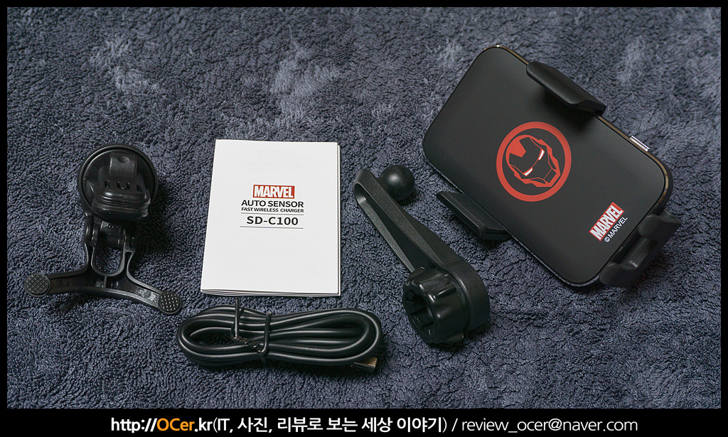 송풍구 거치대와, 메뉴얼, TYPE-C USB 케이블, 송풍구 회피형 확장 어댑터? 어떤 브랜드에서는 360도 스윙암 등으로도 불리더군요. 이 암을 통하여 송풍구 바람의 간섭을 피할 수 있습니다. 그리고 아이언맨 디자인이 적용된 무선 충전 거치대가 들어 있습니다.