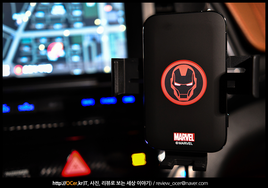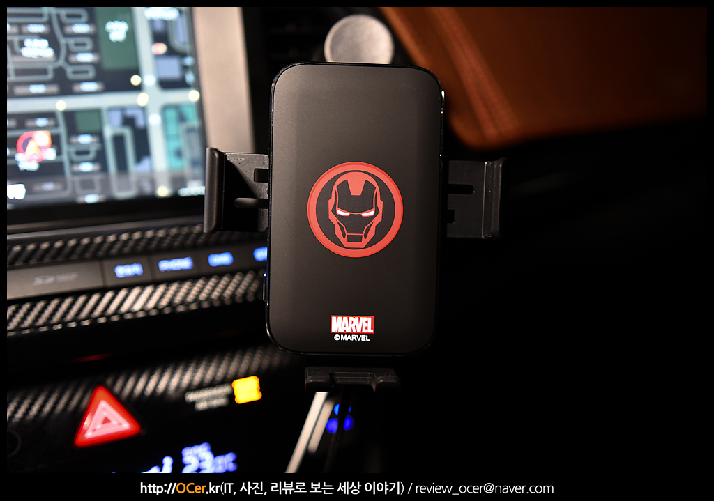 위 제품이 바로 이번 리뷰에서 소개하려는 제품인데요. 작년에 막을 내린 어벤져스의 히어로 아이언맨 디자인의 마블 고속 무선 충전 거치대 입니다. 현재 위 사진에서는 아이언맨 디자인 부분이 LED 가 들어와서 정말 예쁩니다. 사진상으로는 어떻게 느끼실지 모르겠는데, 실물로는 정말 예쁩니다. 은은하지만 선명한 LED 가 마음에 드는 제품인데요. 차량용 무선 충전 거치대의 기본이라 할 수 있는 확실한 고정력과, 15W 고속충전, 그리고 차량의 인테리어까지 책임질 수 있는 제품 입니다.