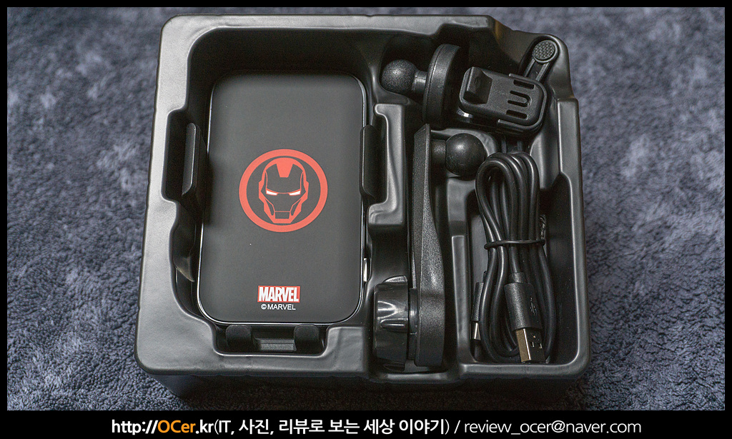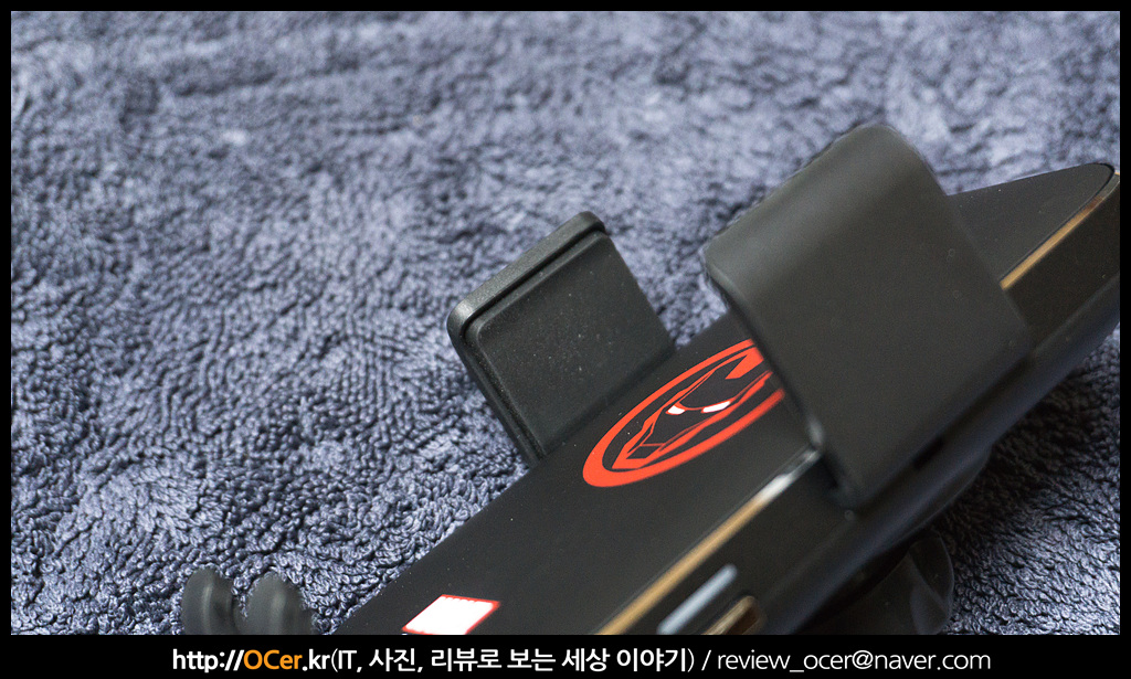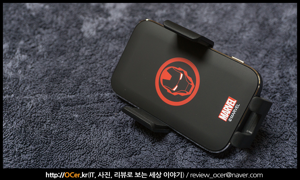 블랙 앤 레드 디자인으로 작동상태가 아니더라도 마치 아이언맨 눈에 LED 가 들어오는 듯한 효과를 줍니다. 뭐 마블 관련 디자인만 빼면 일반적으로 많이 쓰이는 스마트폰 무선 충전 거치대이지만, 마블 요소가 가미되었다는 것만으로도 디자인 효과는 엄청나죠.