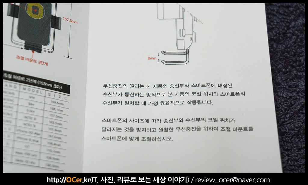 스마트폰 크기에 따라코일 위치가 다르기 때문에 보다 충전 효율을 높이기 위해서는 적절한 위치에 스마트폰이 거치되어야 하는데, 이를 위해서 필요한 것이 바로 3단 조절 마운트 입니다. 위치는 3단으로 최대 8mm 까지 내릴 수 있습니다.