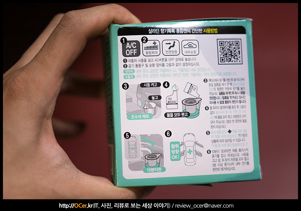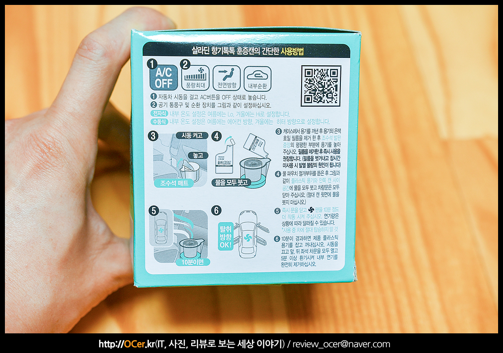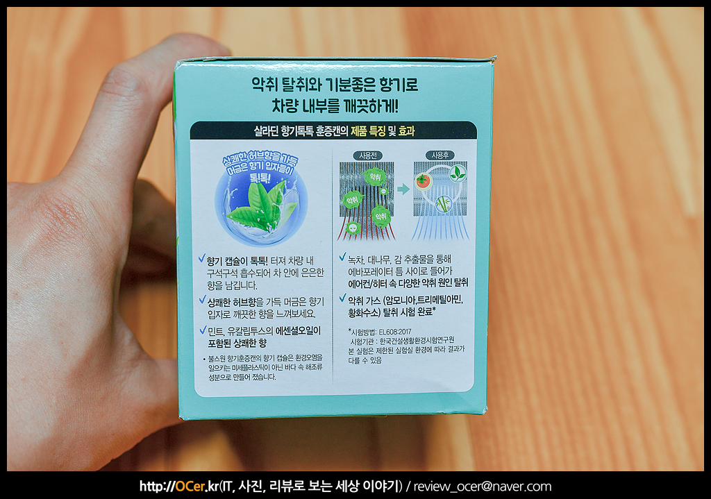 향기톡톡 훈증캔의 특징으로는, 차 구석구석 은은한 향을 남기고, 이 향은 민트, 유칼립투스의 에센셜오일이 포함된 상쾌한 허브향이라고 합니다. 또한 이제 곧 가을이 시작되겠지만, 에어컨 냄새의 원인인 에어컨 에바포레이터 틈 사이로 녹차, 대나무, 감 추출물이 들어가 에어컨/히터 속 다양한 악치 원인에 탈취효과를 줄 수 있다고 합니다. 또한 악취 가스로 알려진 암모니아, 트리리메틸아민, 황화수소 가수의 탈취 시험도 완료된 제품이니 효과가 좋을 듯 합니다.