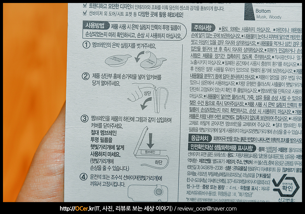 패키징 후면에 제품 특징과 사용 방법에 대해 소개하고 있는데요. 아무래도 선바이저에 장착하는 것이다 보니 공간활용이 좋을 수 밖에 없고, 에센셜 오일이 함유되어 부드러운 향기 입자가 차안 실내를 가득 채워주는 특징도 있습니다. 이건 선바이저 맨 제품에는 여러 향기가 있을텐데, 향기에 따라, 느낌이 다를 듯 합니다.