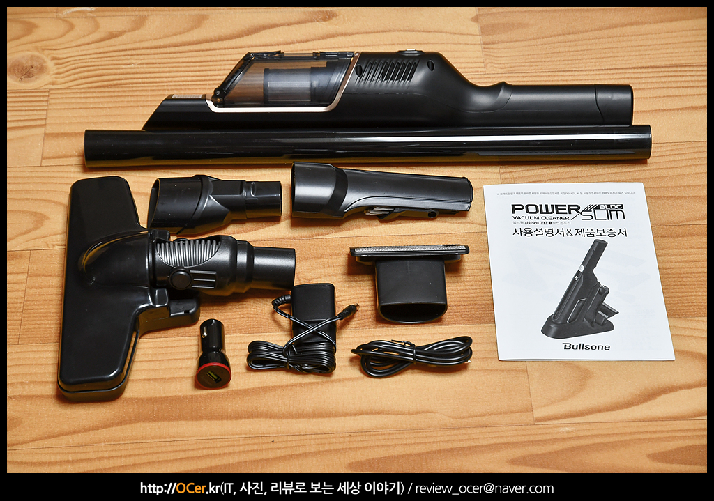 내용물을 모두 꺼낸 모습 입니다. 차량용이라면 저 긴 연장툴과 가정용 바닥 흡입툴은 없었겠죠? 그리고 차량에서 충전을 위해 시거잭 충전기도 하나 제공되네요.