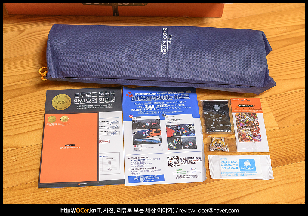구성품을 모두 꺼낸 모습 입니다. 가장 위에 있는 것이 파우치에 담긴 대시보드커버 본 제품이고요. 여러가지 종이 설명서들이 들어 있었습니다.