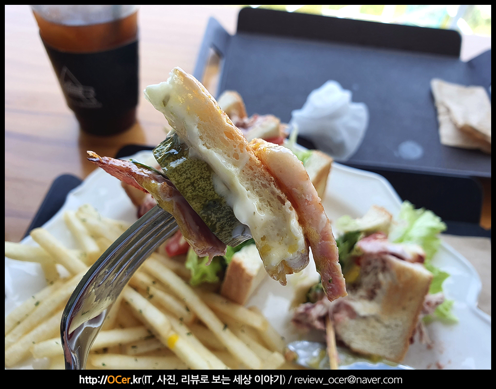 2개 시켜서 조금씩 맛을 보고 있는데 여기는 바닷가인데 야채가 정말 싱싱해서 좋구요. 이 크랜베리치킨 샌드위치는 보기보다 양이 많았습니다. 여자친구가 베이컨 에그베네딕트를 얼추 먹고 나서 샌드위치를 먹다가 남기더라구요. 제가 물론 다 해치웠지만요.