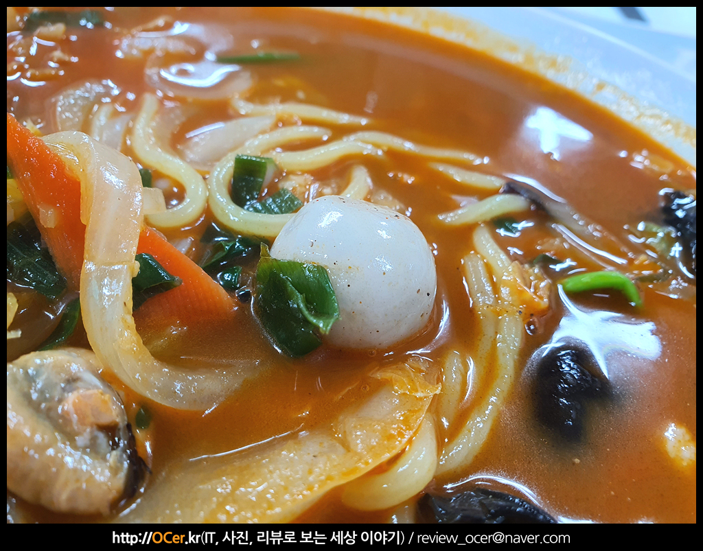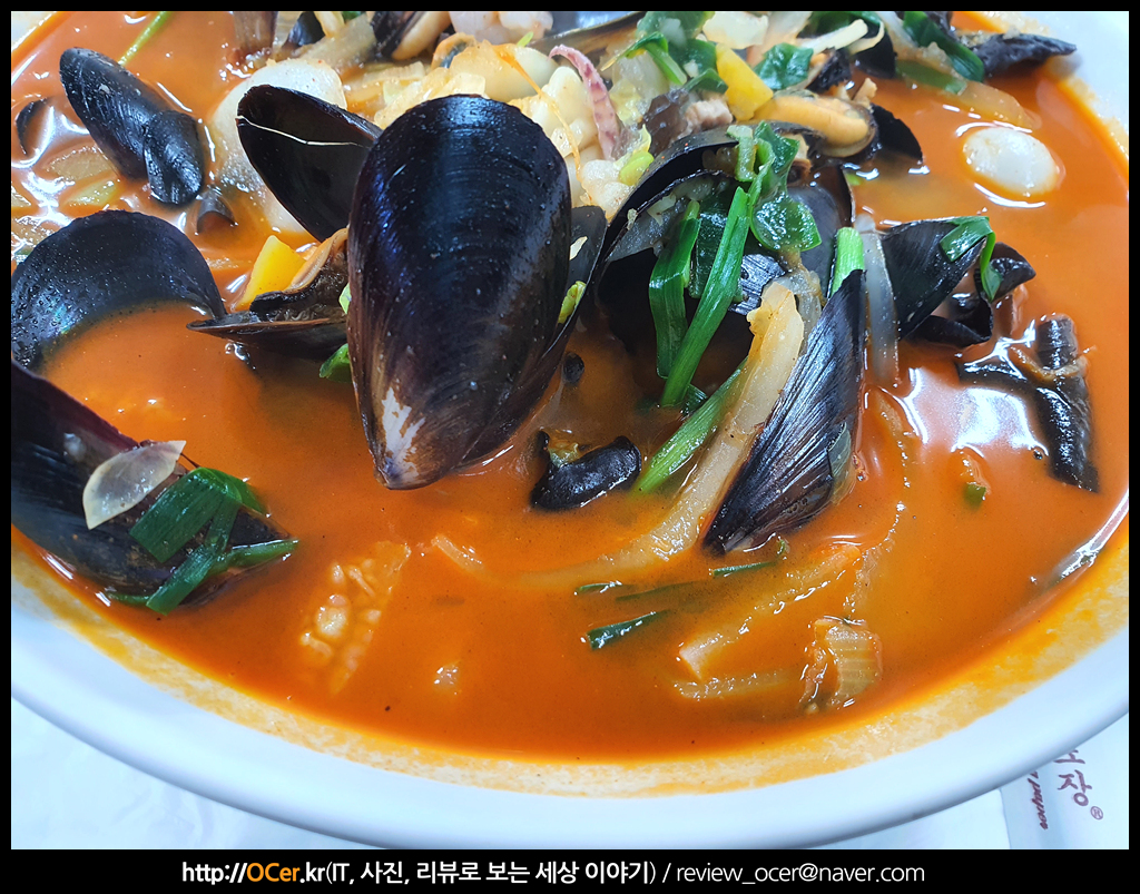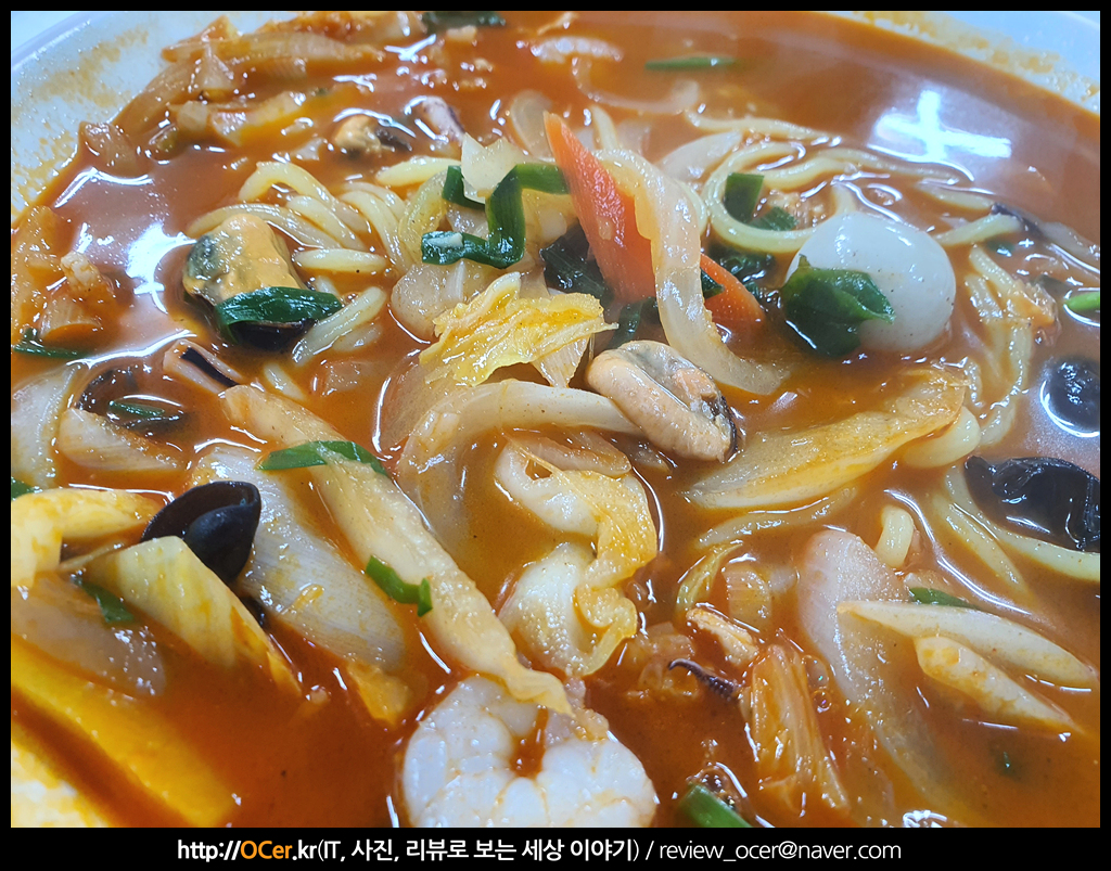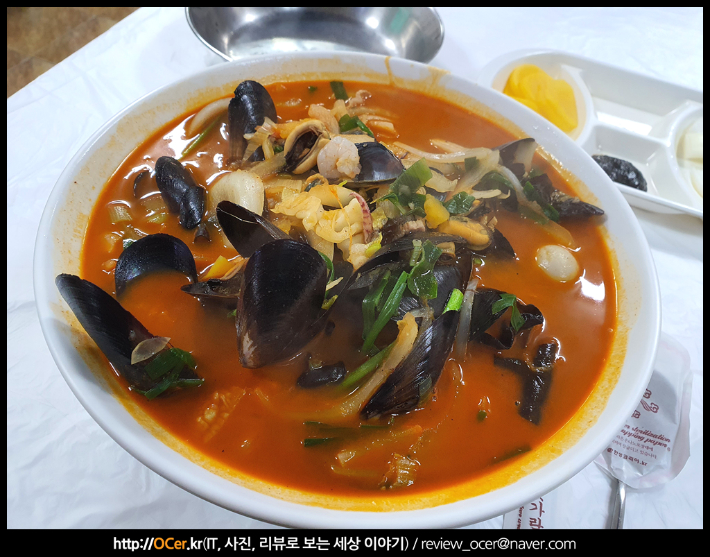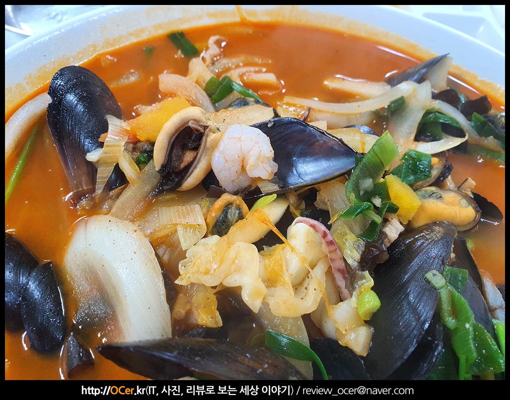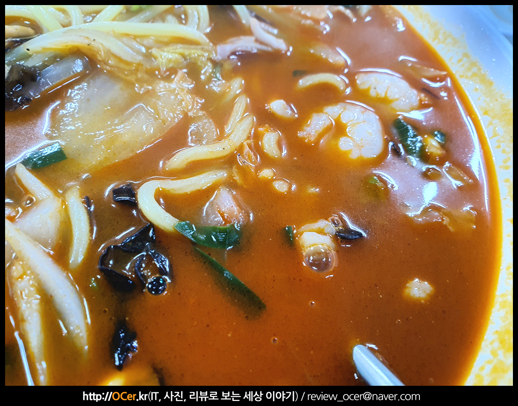 바닷가 근처에 있는 중국집 답게 해산물이 풍부하게 많이 들어가 있습니다. 양파도 많이 들어가구요. 새우나 오징어, 홍합 등등 많이 들어가요.