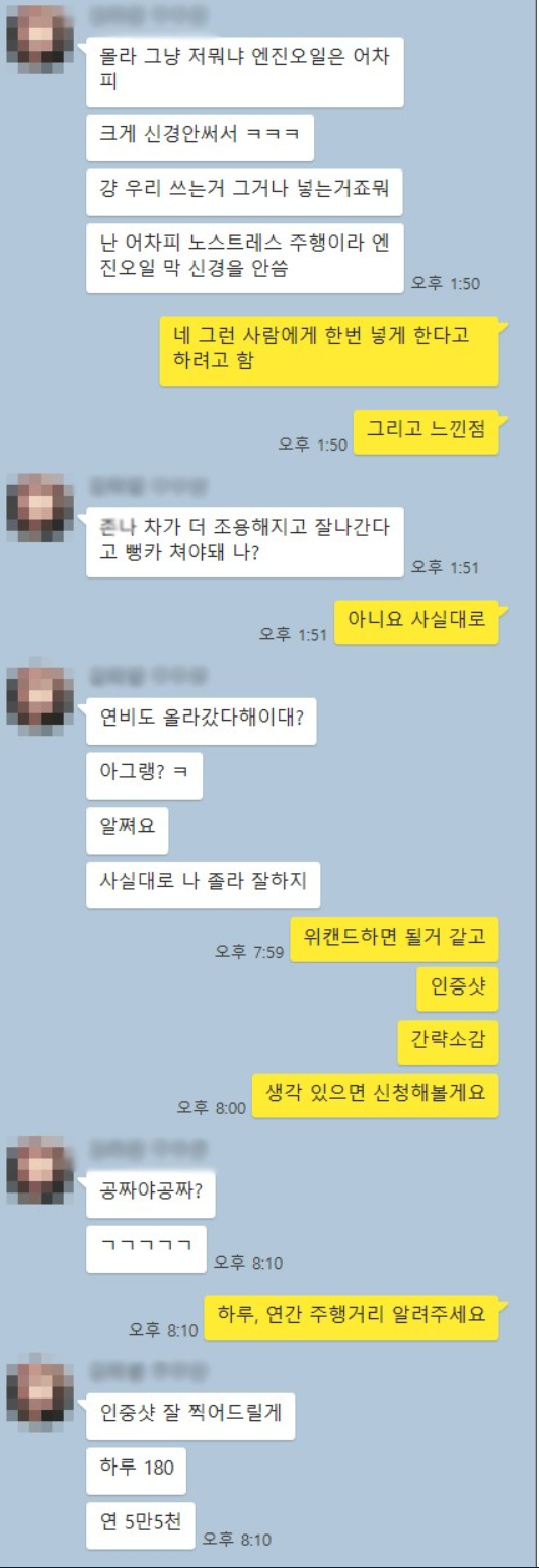 이번에 교환한 차주께서도 처음 사용해본 엔진오일이지만 만족해하시는 것 같아 저도 굉장히 뿌듯하고, 좋은 제품 사용할 수 있게 해드린 것 같아 기분이 좋습니다. 제가 추천해서 사용해본 오일을 만족해하니 당연하겠지만요~