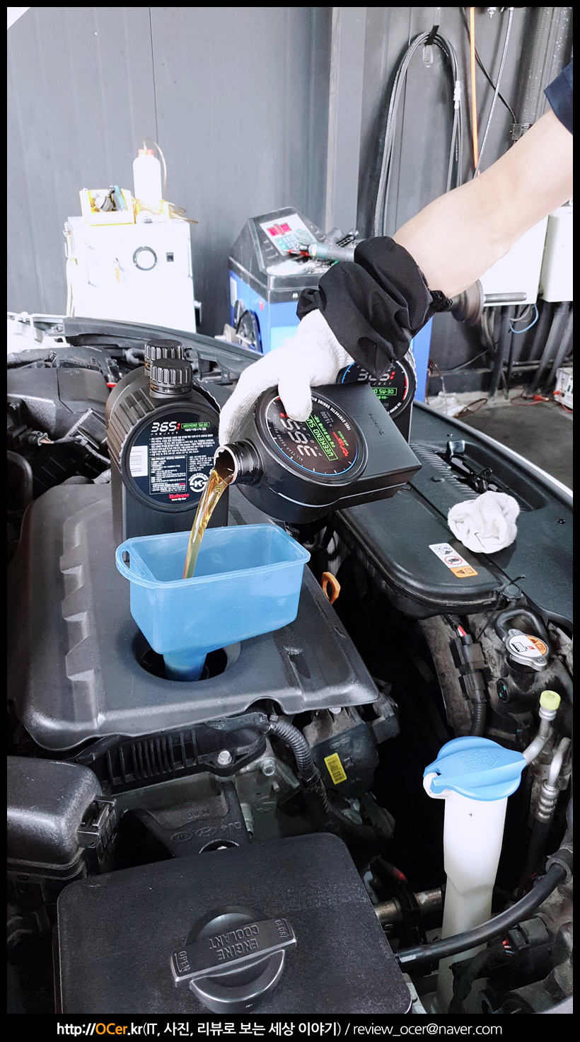 잔유제거가 완료되면 불스원 365 프로젝트 엔진오일을 넣어줍니다. LF 소나타 디젤은 1.7L 엔진으로 잔유제거를 완벽히 하면 5L 가 좀 넘고 보통은 1L 짜리 5통 들어갑니다.