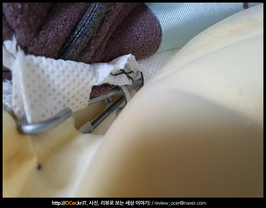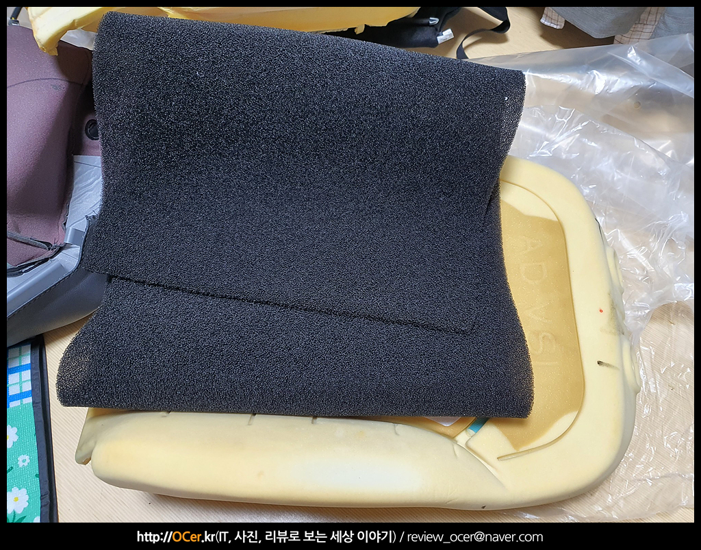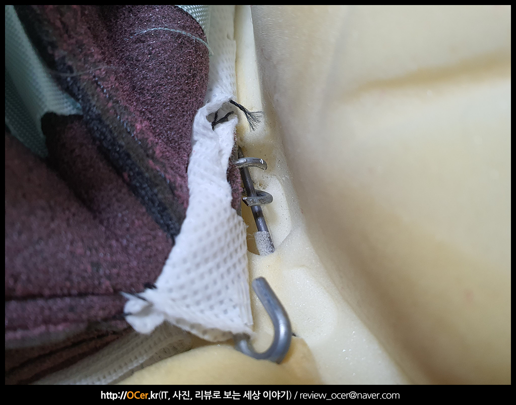그리고 가죽과 쿠션을 분리해서 통풍용 쿠션으로 교체해야 하는데요. 이때 주의할 것이 앉는 부분은 벨크로(찍찍이) 로 고정되어 있는데, 팍 뜯으면 쿠션에서 이 벨크로가 뜯겨져 나와서 귀찮은 작업이 추가됩니다. 가장 끝 부분부터 살살 뜯어낸 후, 벨크로 부분을 눌러주면서 분리해야 재활용할 수 있습니다. 물론 이 쿠션은 다시 쓸 일은 없고 중고나 무료나눔으로 방출될 녀석입니다.