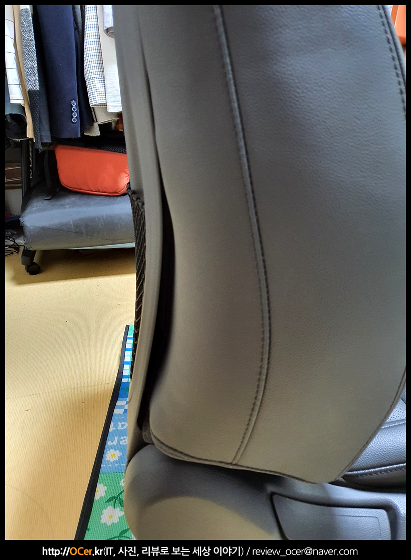 조수석에서 바깥쪽(우측) 에 에어백이 들어가 있는데 이쪽 방향 시트백커버가 제대로 맞물리지 않고 위와 같이 떠버리네요. 고민하다 순정 부품을 조회해보니.. 등쪽 쿠션은 에어백 위치가 서로 반대 방향이라 방향성을 갖고 있었습니다. 저렇게 안맞는 이유는 제가 조수석에 낀 쿠션이 바로 운전석용이기 때문입니다.
