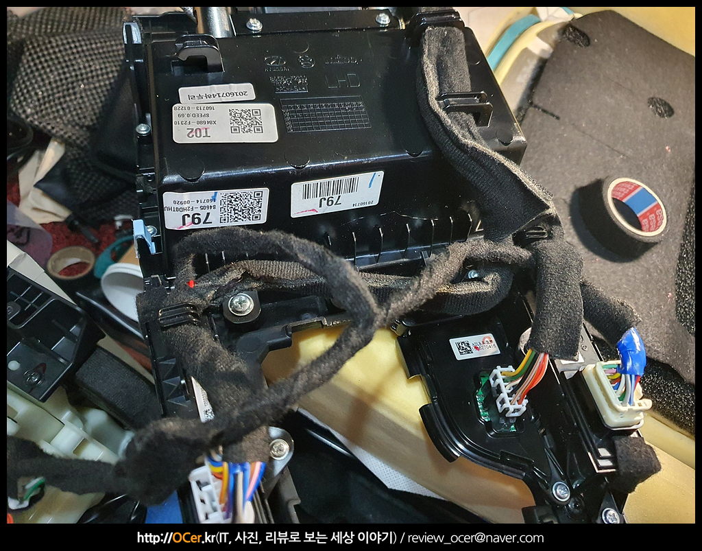 정상 작동되는 것을 확인하고, 납땜하였던 배선들도 기존 순정 배선라인을 따라 잘 정리해줍니다. 마무리는 역시 테사 흡음 테이프!