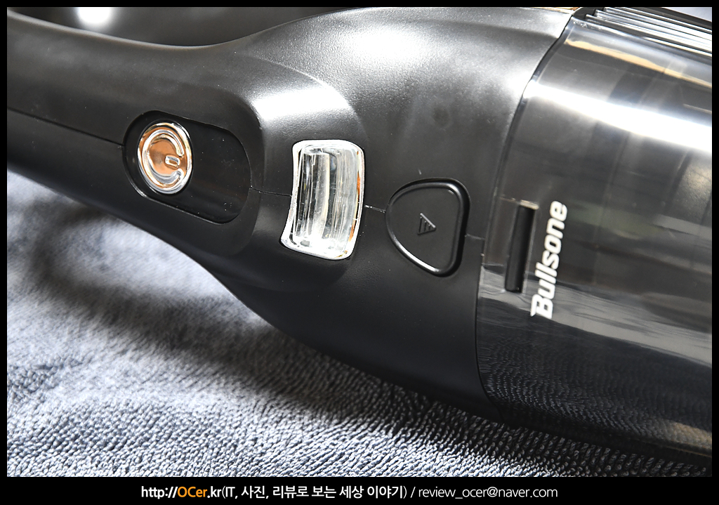 손잡이 앞쪽으로 전원 버튼과, LED 라이트, 그리고 먼지통 분리 버튼이 있습니다.