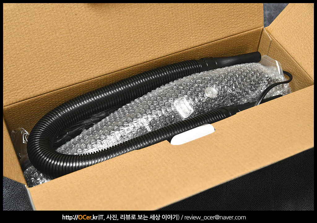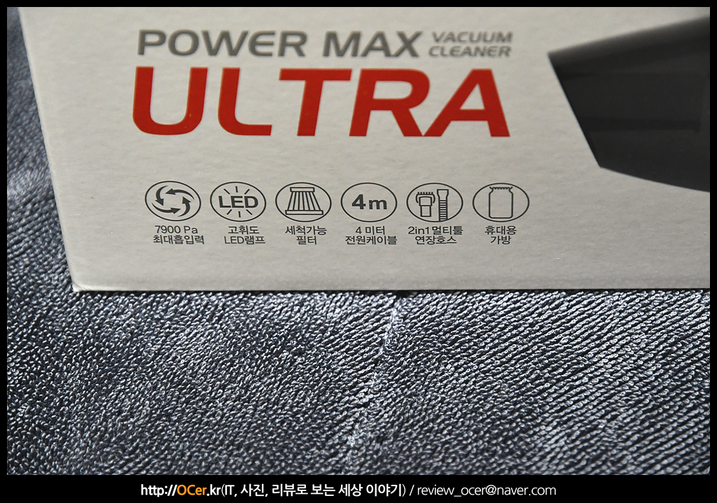 패키징 박스에서 살펴볼 수 있는 특징으로는 최대 7900Pa 흡입력, 고휘도 LED 램프, 세척 가능한 필터, 시거잭 전원 케이블은 4m 길이라는 것과 투인원 연장 호스와 휴대용 가방이 제공된다는 것 입니다.