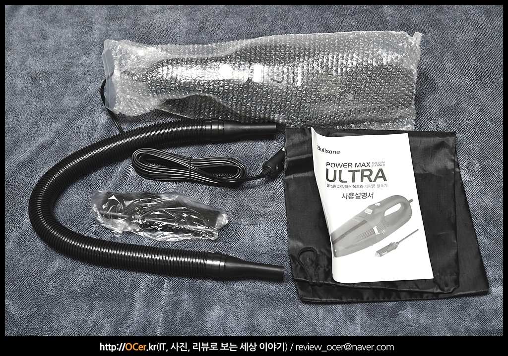 구성품 입니다. 비닐 완충제에 들어 있는 것이 불스원 파워맥스 울트라 자동차용 시거잭 청소기 본체이고, 청소시 유용한 툴과 파우치가 있네요.