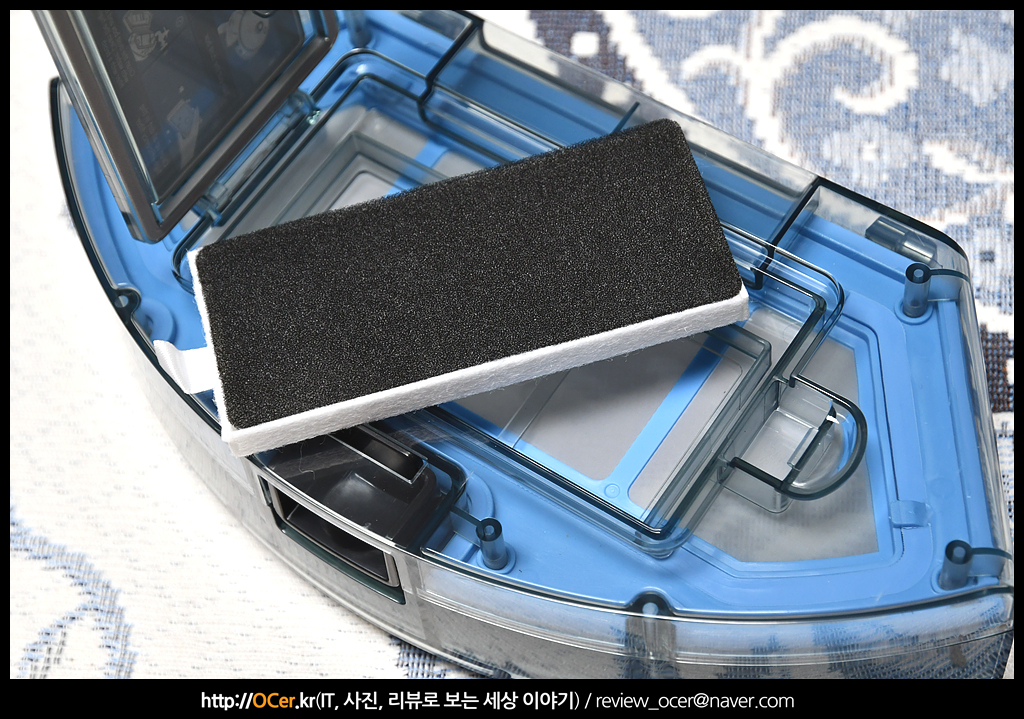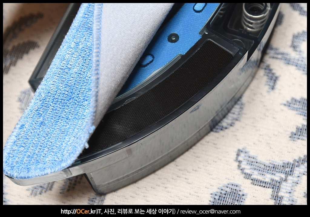 물걸레질을 하려면 걸레포(타월) 가 있어야겠죠? 이렇게 벨크로 타입으로 부착할 수 있습니다. 총 2개 제공되니 하나를 사용한 후 빨아두고, 다른 하나로 사용하면 됩니다. 에코백스 제품들은 1회용 타월 같은 것도 있던데 이 제품은 있는지 모르겠네요.