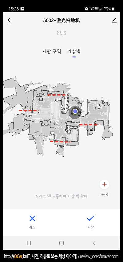 그리고 가상벽이나, 제한구역을 설정하여 이동하지 못하거나, 청소하지 못하게 설정할 수도 있습니다. 저희 집은 확장이 안된 아파트다 보니 베란다로 나가는 곳에는 턱이 있어서 나가기는 가능하지만 반대로 턱을 넘어서 오지는 못하더군요. 그래서 반드시 가상벽을 쳐주는 것이 좋았습니다.
