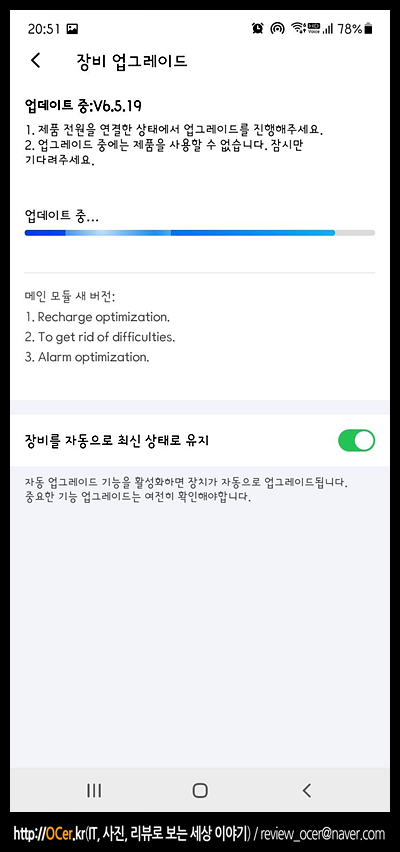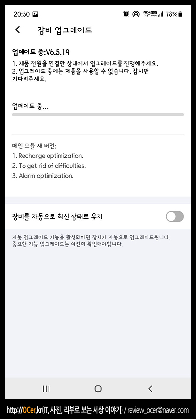 연결하자 마자, 신규 펌웨어가 있다네요. 바로 업그레이드를 누르면, 뭐 무선으로 업그레이드가 됩니다. 그리고 업그레이드 과정 동안 하단에 "장비를 자동으로 최신 상태로 유지"를 체크해 주면 다음부터는 자동으로 업데이트 되겠죠?