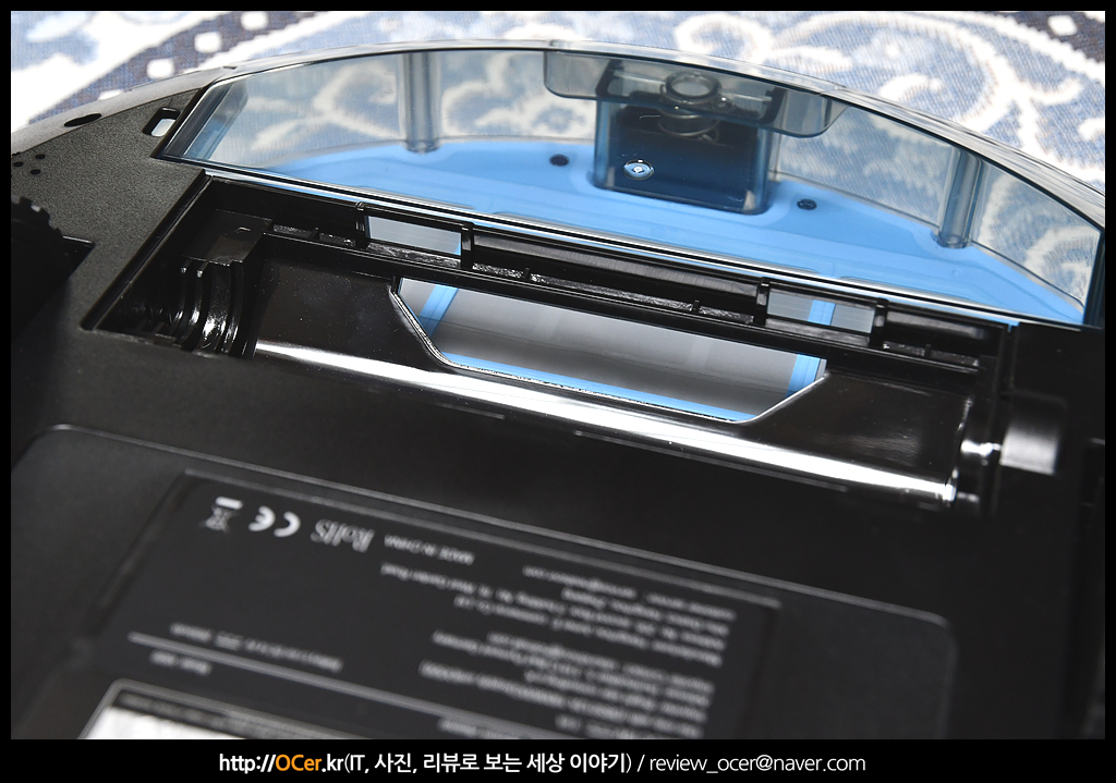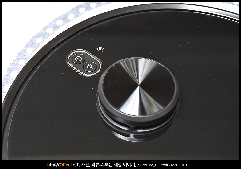 상단부에는 전원 버튼과, 충전 도크 복귀 버튼이 있습니다. 전원 버튼을 꾹 누르고 있으면 전원이 켜지고, 그 상태에서 또 한번 꾹 누르고 있으면 와이파이가 켜집니다. 청소 중에 한번 누르게 되면 일시정지/재개가 됩니다. 충전도크 복귀 버튼은 한번만 누르면 복귀합니다. 버튼 아래 위로 튀어 나온 것은 LDS 입니다. 요즘 로봇 청소기에 가장 많이 탑재되는 센서인데요. 초기 자이로스코프에 비해 장애물 극복 능력이나 탐색 능력이 좋은 편 입니다. 하지만 청소 알고리즘에 따라 차이는 있습니다.