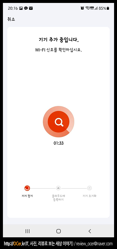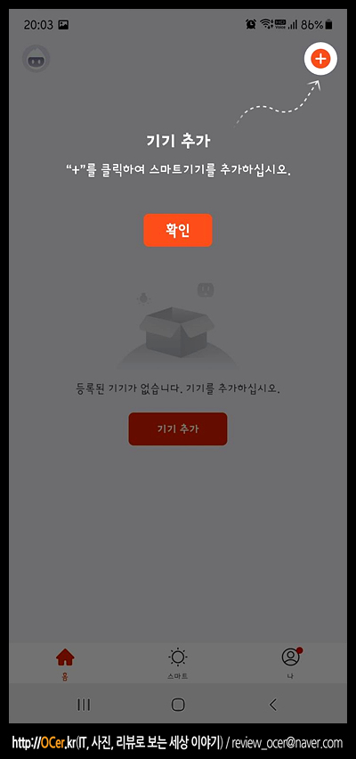 우측 상단에 + 를 누르면 기기추가를 하게 됩니다. 그리고 나서 기기를 추가하기 위한 과정이 진행되는데, 기본적으로 와이파이나 블루투스를 활성화한 후에 하는 것이 좋습니다.