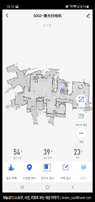 그러면 지가 돌아다니면서 지도를 생성하는데, 여기서 한가지 아쉬운 점은 보통 저는 청소를 시작할 때 거실에서 앱을 통해 시작하는데, 생성되는 지도가 로봇청소기를 어느 방향으로 놓던지 거꾸로 돌아가 있네요. 위 지도 상태에서 시계 반대방향으로 90도 회전해야 정상적인 구조 입니다. 뭐 그래도 주인은 아니깐 이대로 진행하구요~ 메뉴를 하나씩 살펴 봅니다.