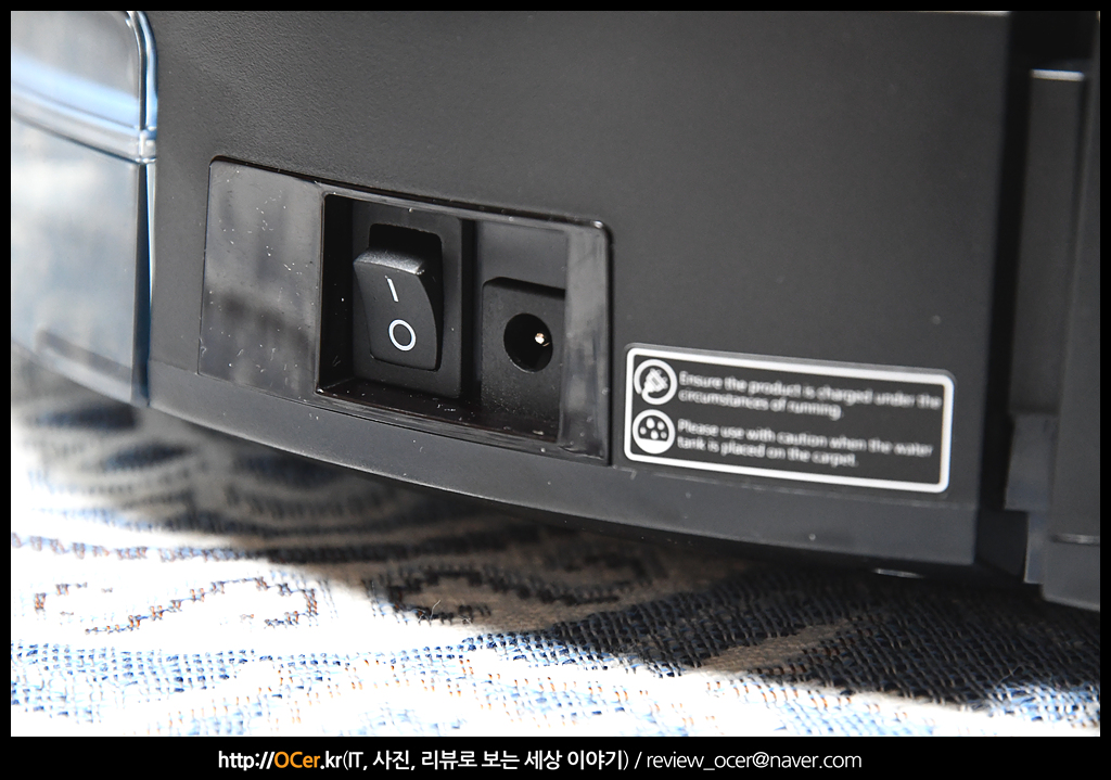 그리고 먼지통 우측으로 전원 스위치와, 전원 입력부가 있습니다. 충전도크를 통해 충전도 가능하지만, 전원 케이블을 다이렉트로 연결하여 충전도 가능합니다.