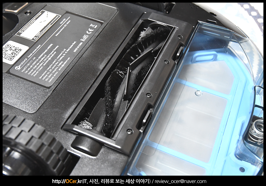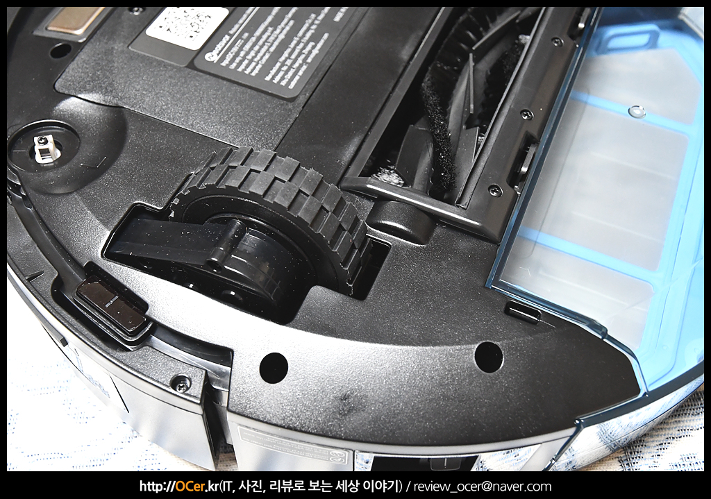그리고 조금 내려와서 메인 브러쉬 양쪽에 커다란 휠이 있습니다. 에코백스 디봇 오즈모 950 의 휠이 일반 타이어 같다면 이 제품은 오프로드 타이어 같습니다. 접지력 보다는 장애물을 극복하는데 더 장점을 가지고 있는 것 같습니다.