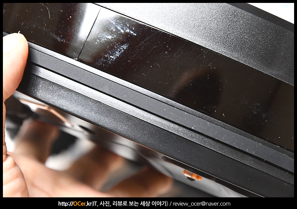 측면 데투리에는 스크레치 방지를 위한 보호테잎이 부착되어 있습니다. 저기 스크레치 같이 생긴 것은 본체에 생긴 것이 아닌 테잎에 생긴 자국 입니다.