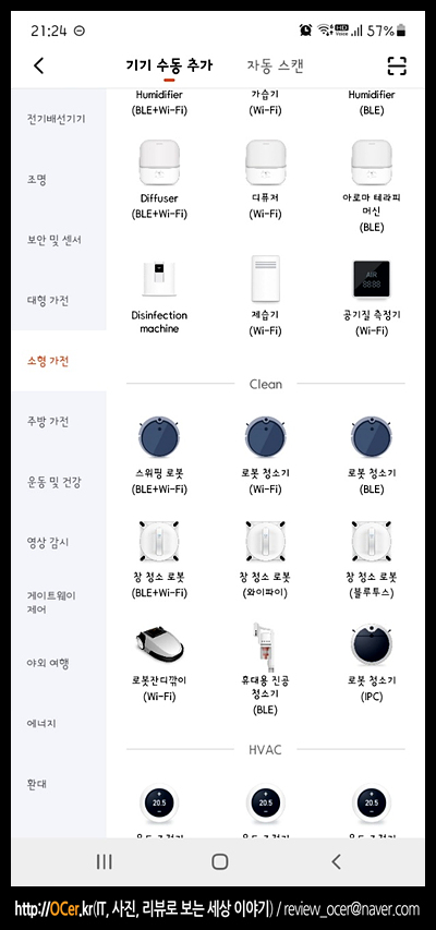 사용하고 있는 와이파이 신호를 잡아주고, 기기 추가를 진행합니다. 여기서 시간이 좀 오래 걸렸는데요. 자동 스캔을 하게 되면 잡지를 못하네요. 기기 수동 추가를 통해 해줘야 하는데, 소형 가전에서 로봇청소기(Wi-Fi) 를 선택합니다.