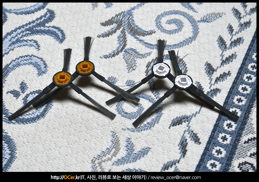 그리고 사이드 브러쉬는 양쪽에 2개가 장착되는데, 노란색과 흰색으로 방향을 표시해두고 있습니다.