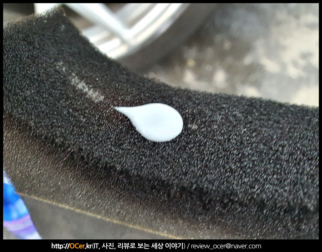 새벽에 세차를 하느라 추워서 그런지 사진이 좀 흔들렸네요. 대부분의 젤 형식의 타이어 코팅제가 그렇듯 점성이 좀 있는 편 입니다. 타이어 어플리케이터에 소량 묻힌 후 문지르면 되는데, 너무 많이 묻힐 경우, 어플리케이터 깊숙히 스며들기 때문에 낭비가 심해질 수 있습니다. 소량만 묻혀주세요.