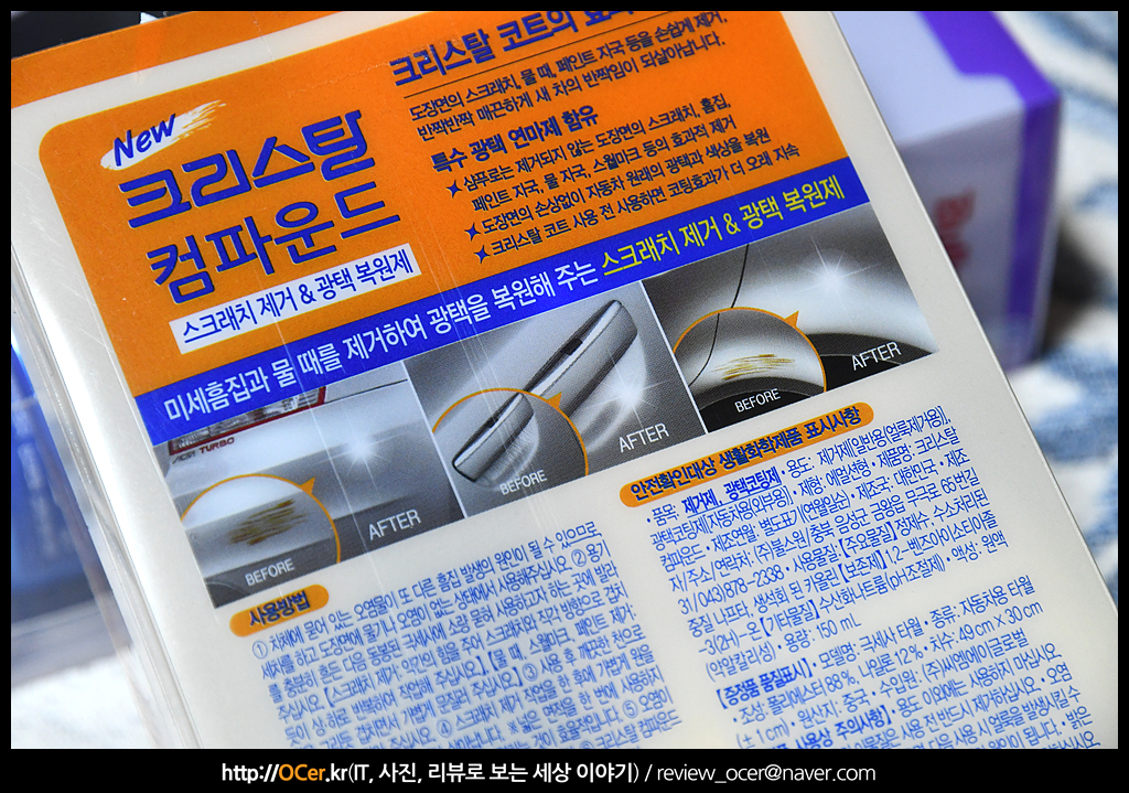 패키징 뒷면을 살펴보면, 크리스탈 컴파운드 특징을 소개하고 있는데, 미세흠집과, 물때 제거를 제거하여 광택을 복원해주는 스크레치 제거 & 광택 복원제라고 소개하고 있습니다.