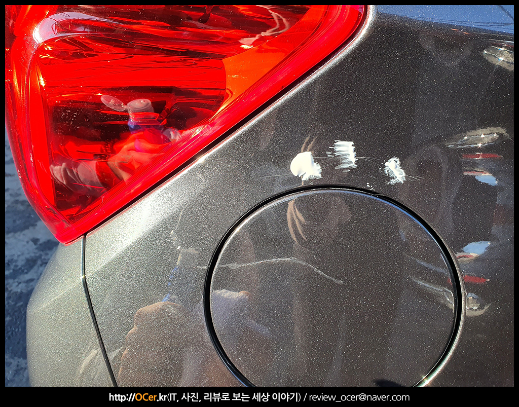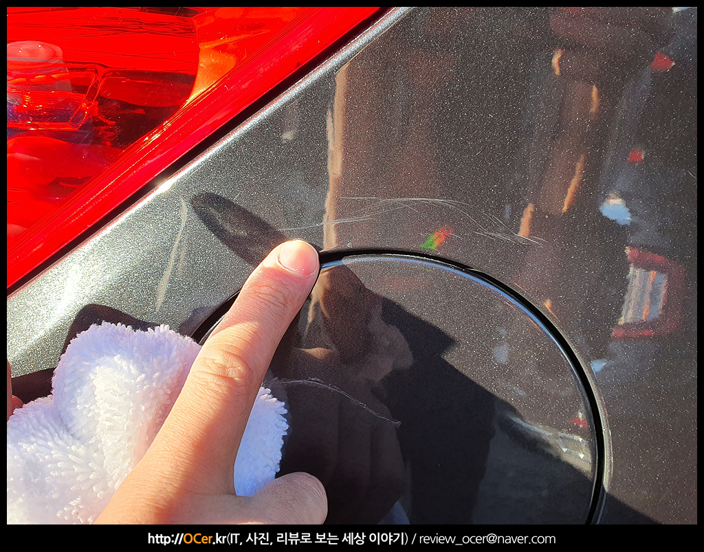 중고이긴 하지만, 상품화도 되지 않은 채로 가져와서 그런지 외장은 그렇게 좋은 편은 아닙니다. 여기저기 문콕도 있고 미세 스크레치들도 꽤 있습니다. 아직 광택도 해주지 않았지만, 핸드폴리싱으로 없어질만한 곳은 일단 문질러 봅니다. 가장 먼저 눈에 띈 곳은 주유구 윗쪽 입니다. 주유구에도 전 차주가 긁혀서 붓펜으로 얼룩덜룩 칠해진 곳이 있지만 여기보다는 윗쪽 라인이 없어질 것 같아 보여서 도전해 봅니다. 아주 살짝 손톱에 걸리긴 하나.. 도전.